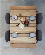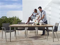 Venkovní stoly a křesla z hliníku a teaku.