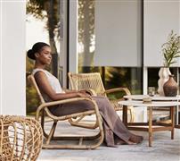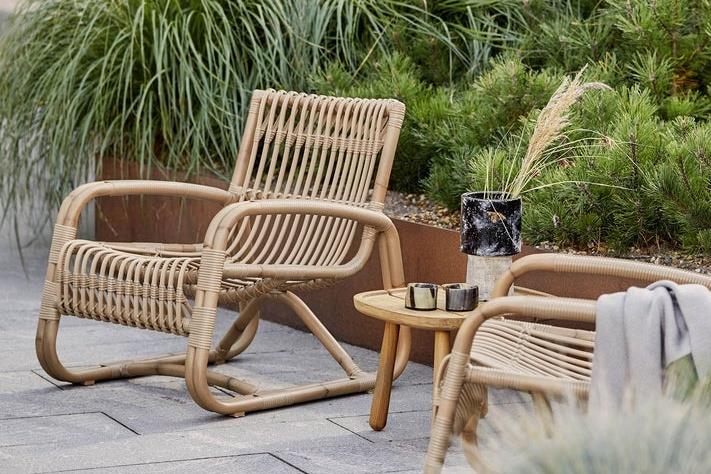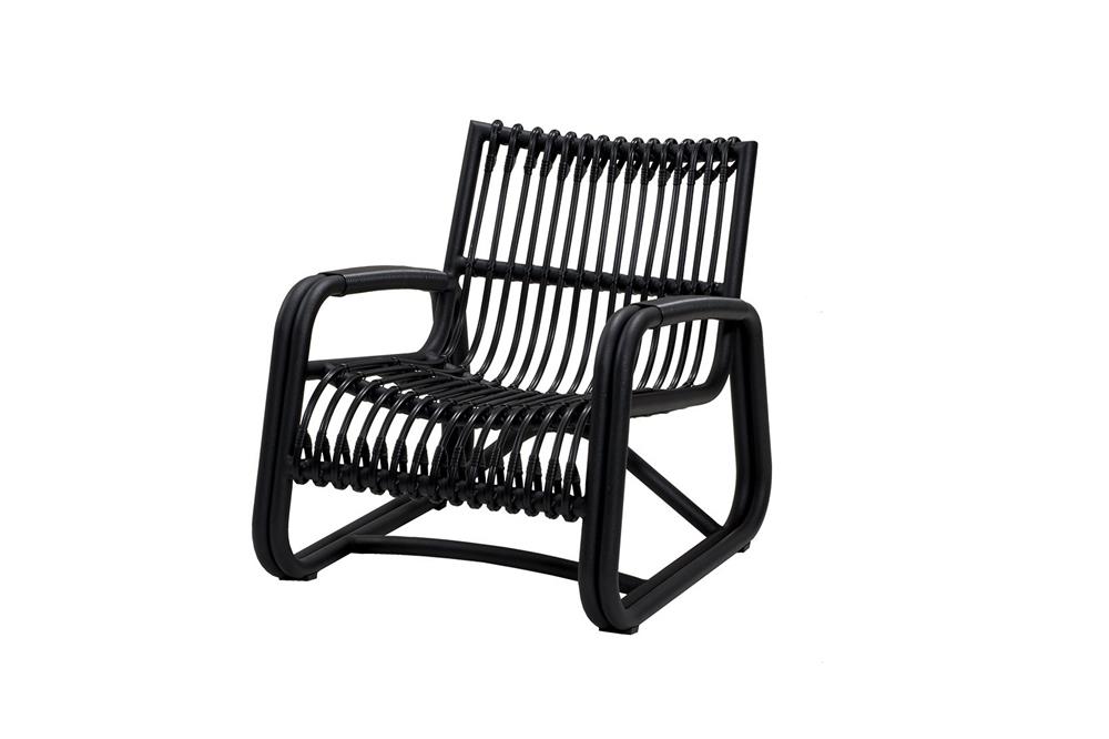 Nízké venkovní křeslo. Zahradní křeslo má hliníkový rám a výplet z umělého ratanu.