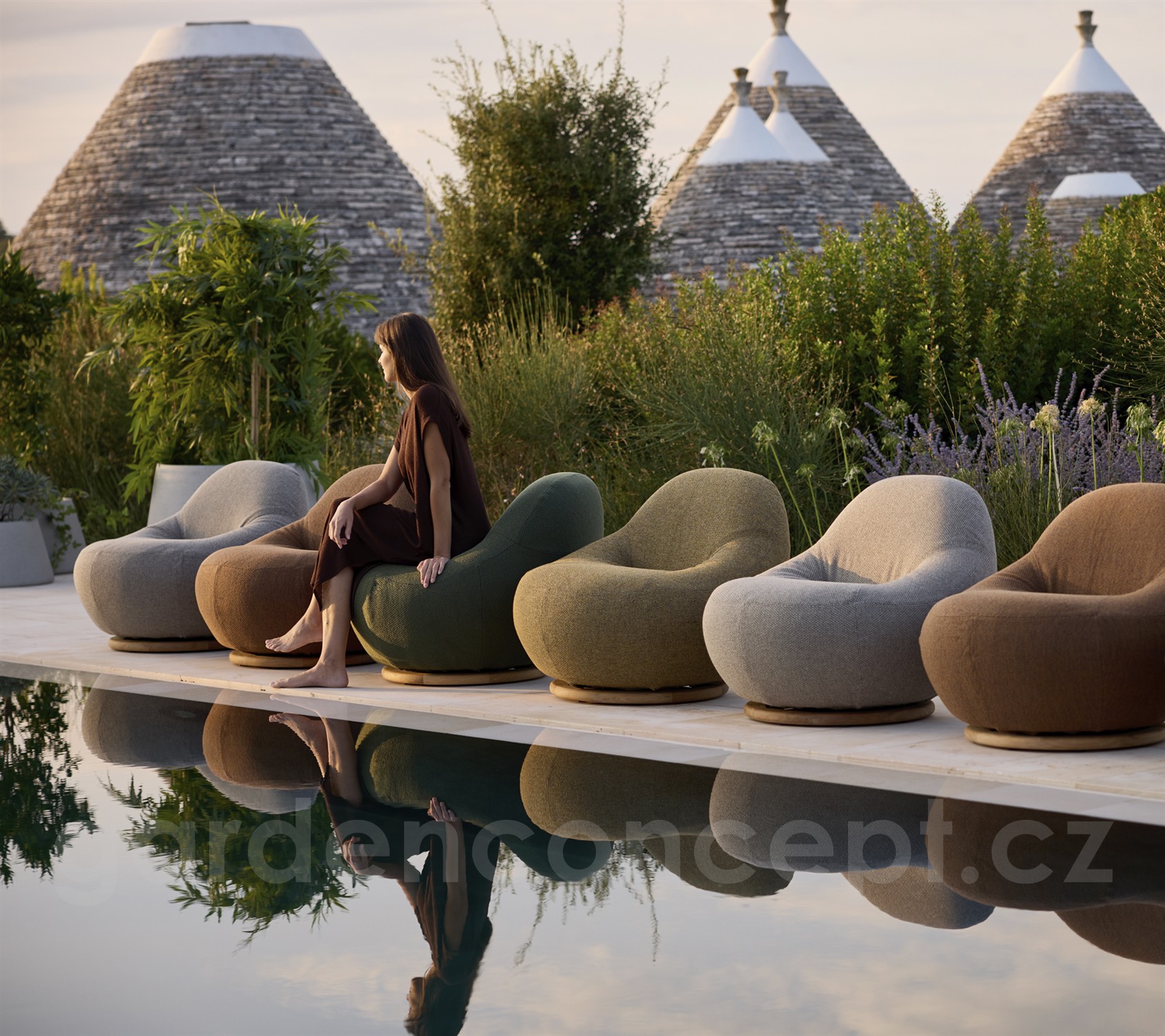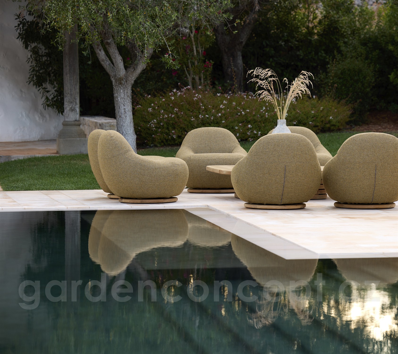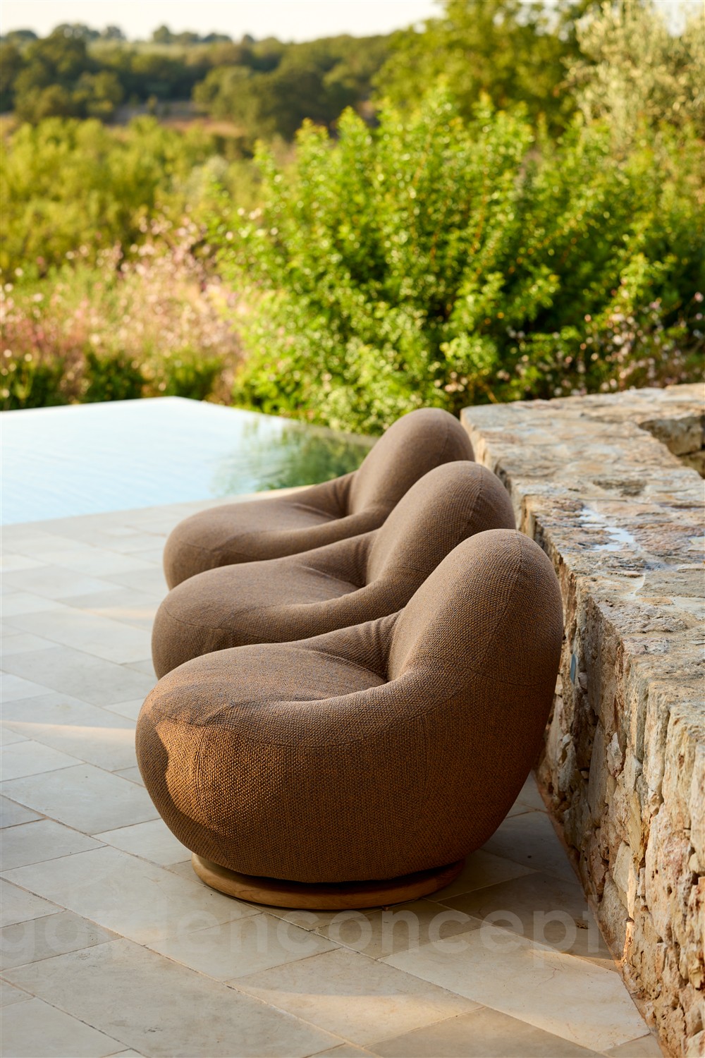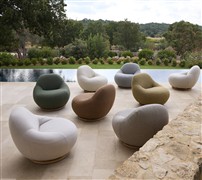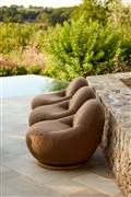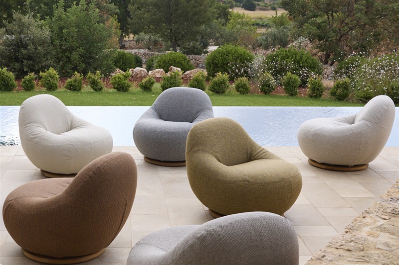 Křeslo je plně čalouněné s otočnou základnou z teakového dřeva.