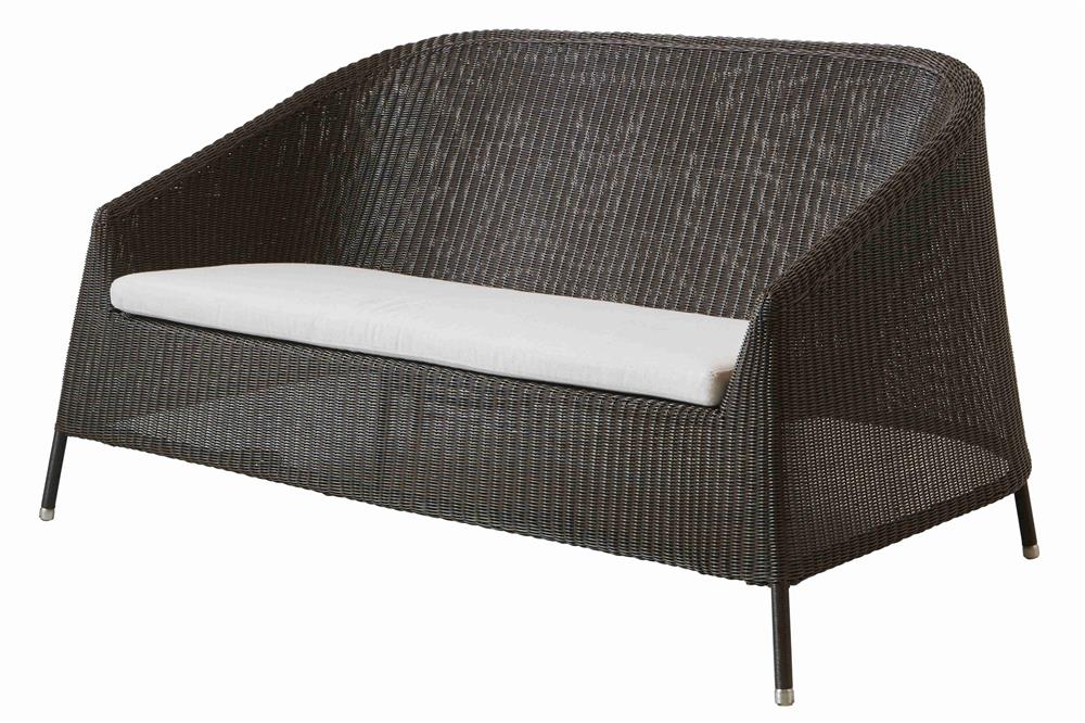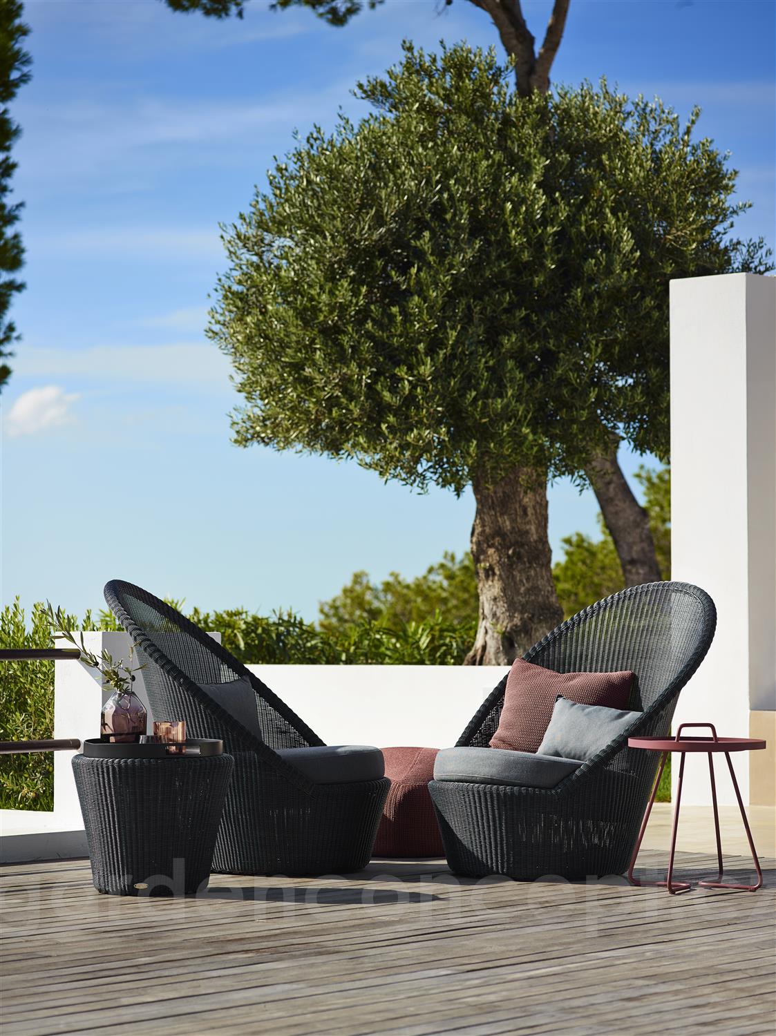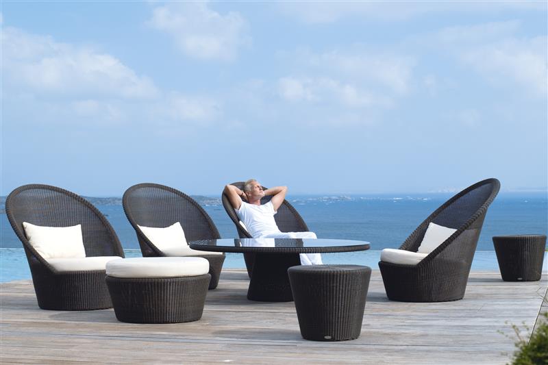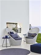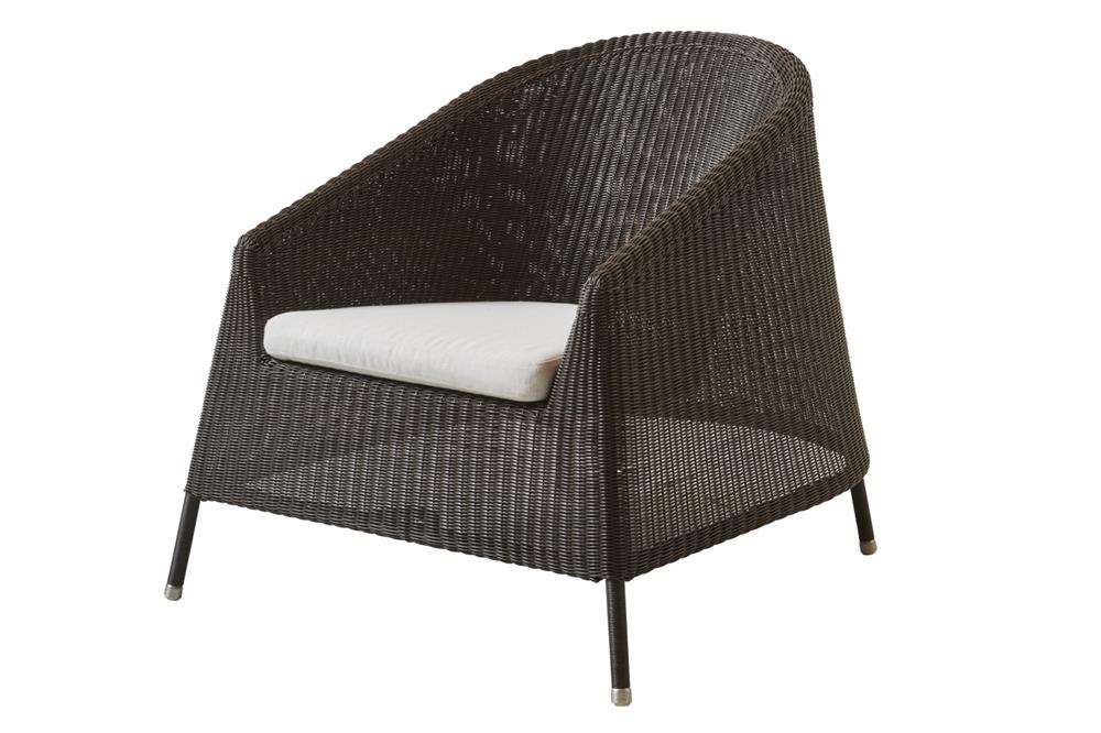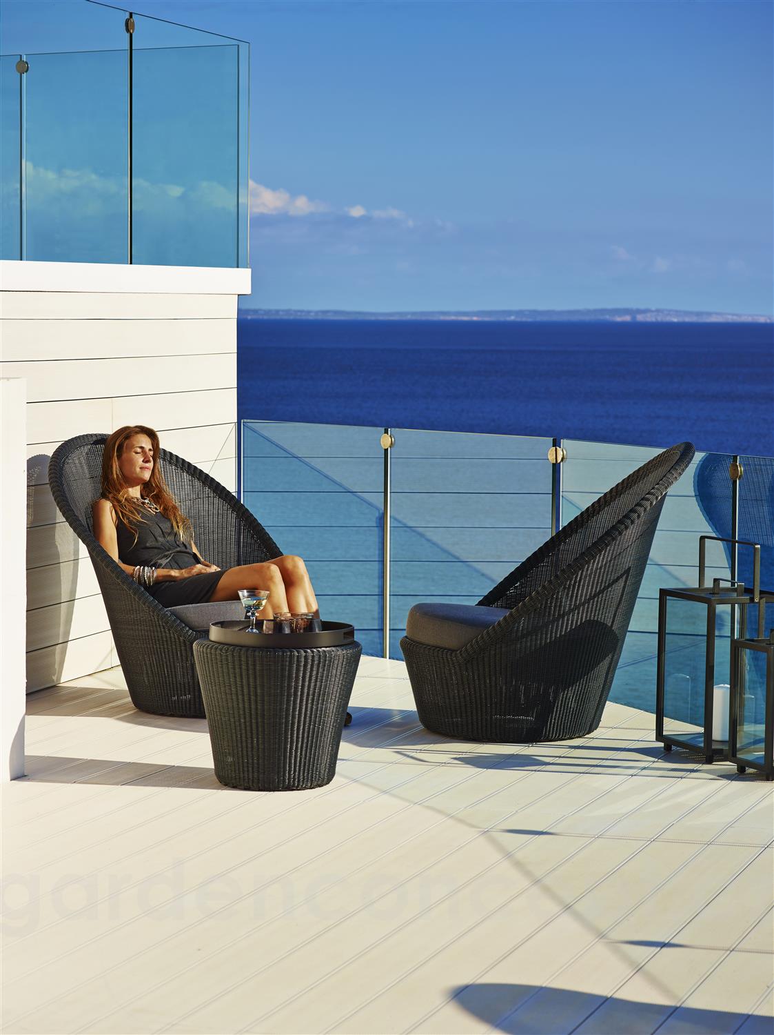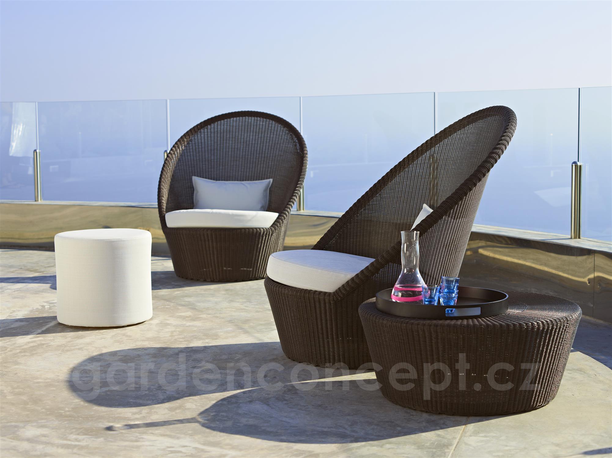 Kolekce venkovního nábytku z umělého ratanu Kingston značky Cane-line. Součástí kolekce je zahradní stohovatelné nízké křeslo, stohovatelná dvoumístná pohovka, nízké křeslo s vysokým opěrákem, podnožka a odkládací stolek.