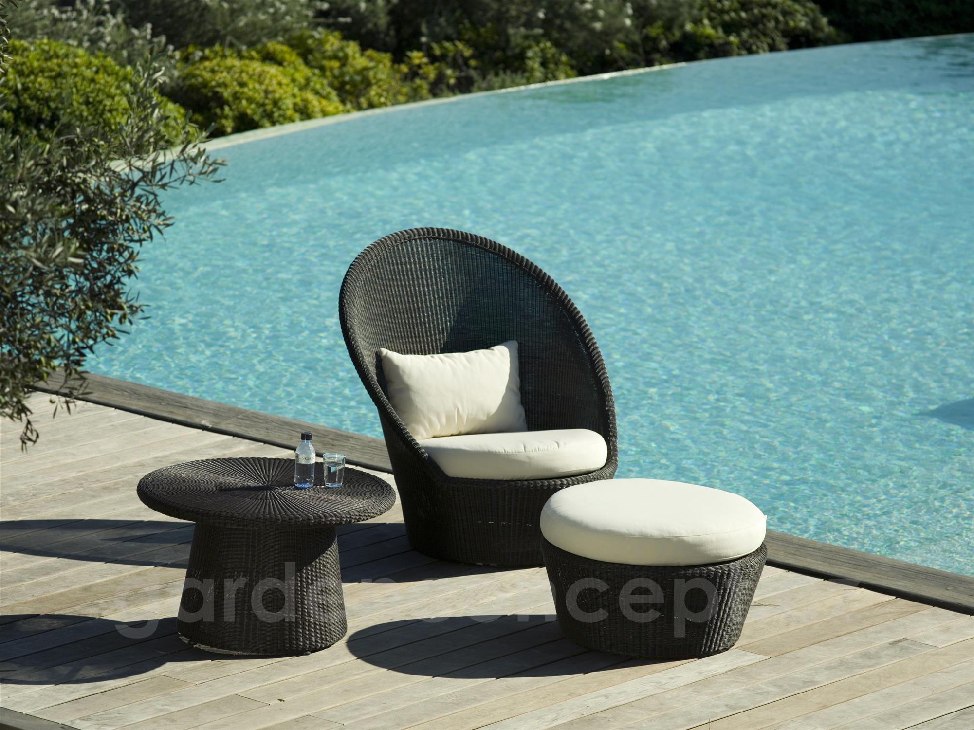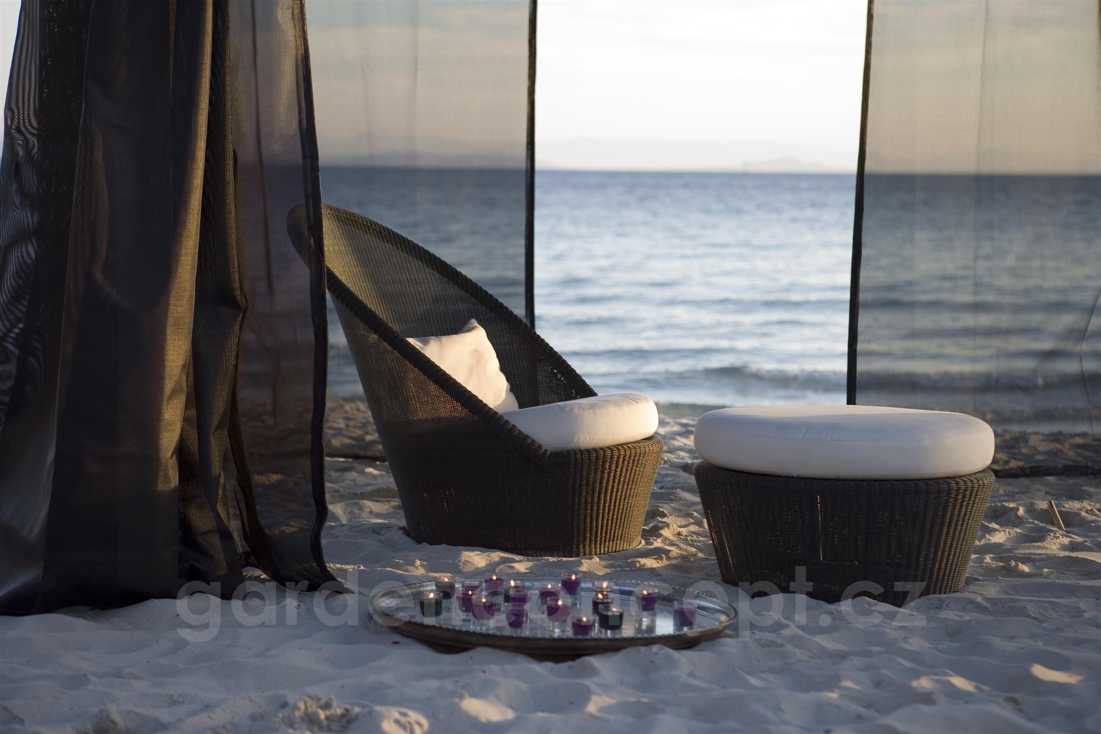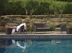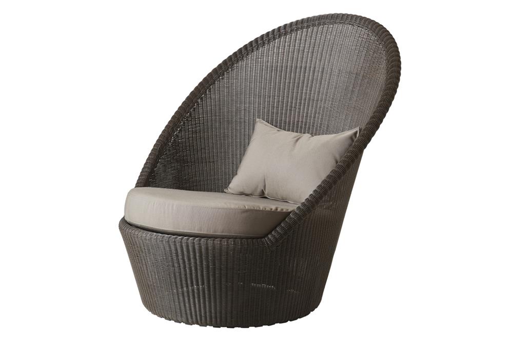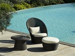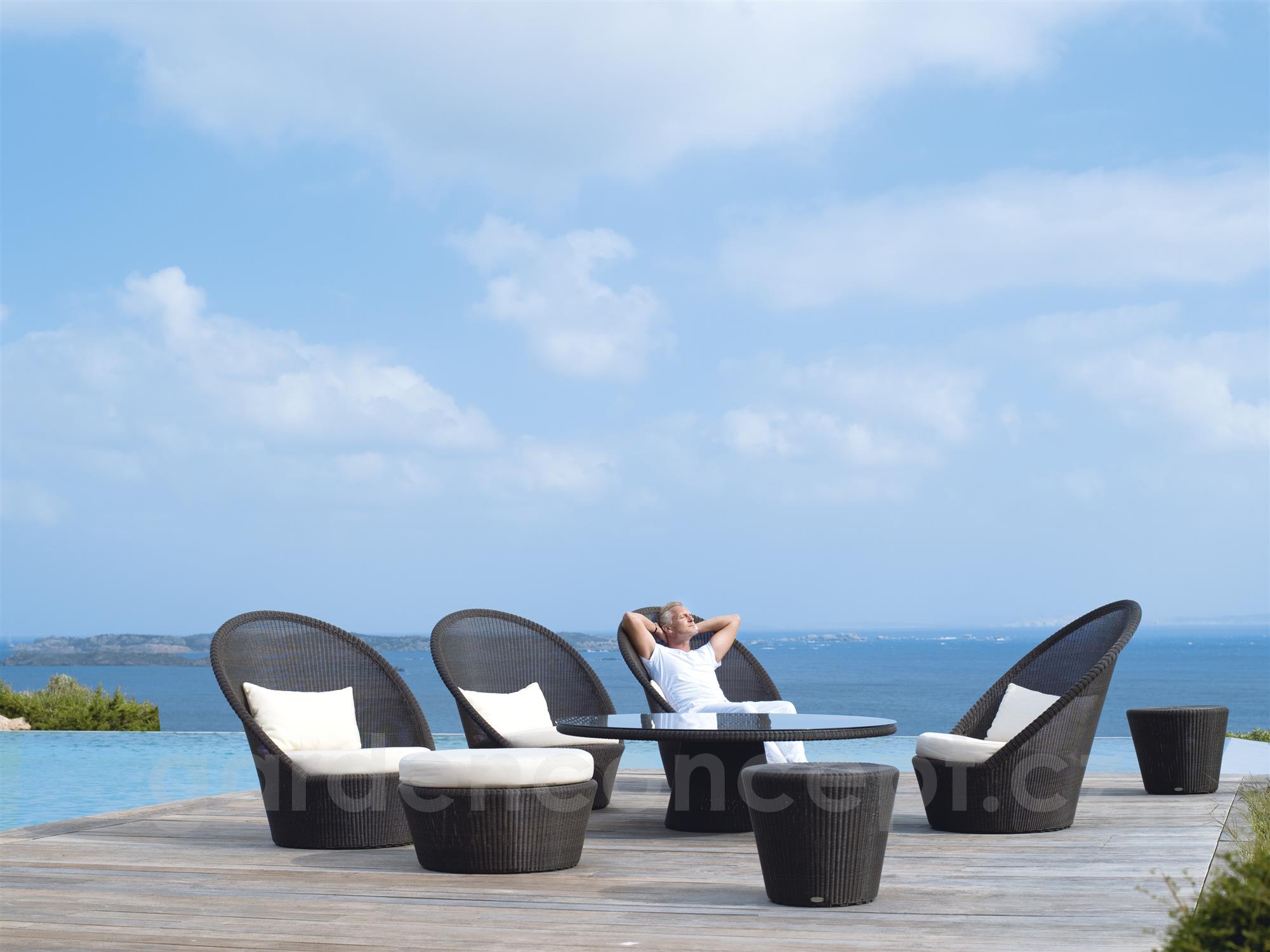 Kolekce venkovního nábytku z umělého ratanu Kingston značky Cane-line. Součástí kolekce je zahradní stohovatelné nízké křeslo, stohovatelná dvoumístná pohovka, nízké křeslo s vysokým opěrákem, podnožka a odkládací stolek.