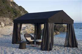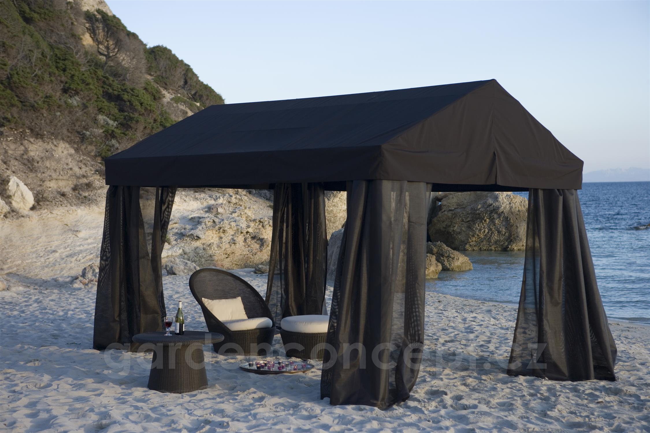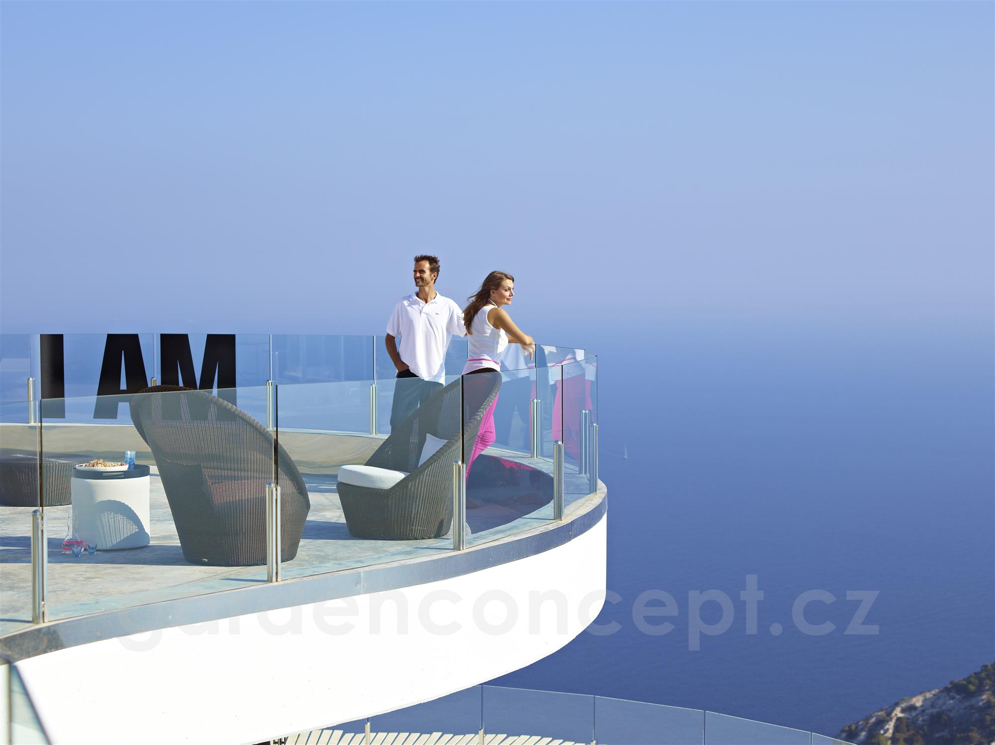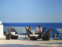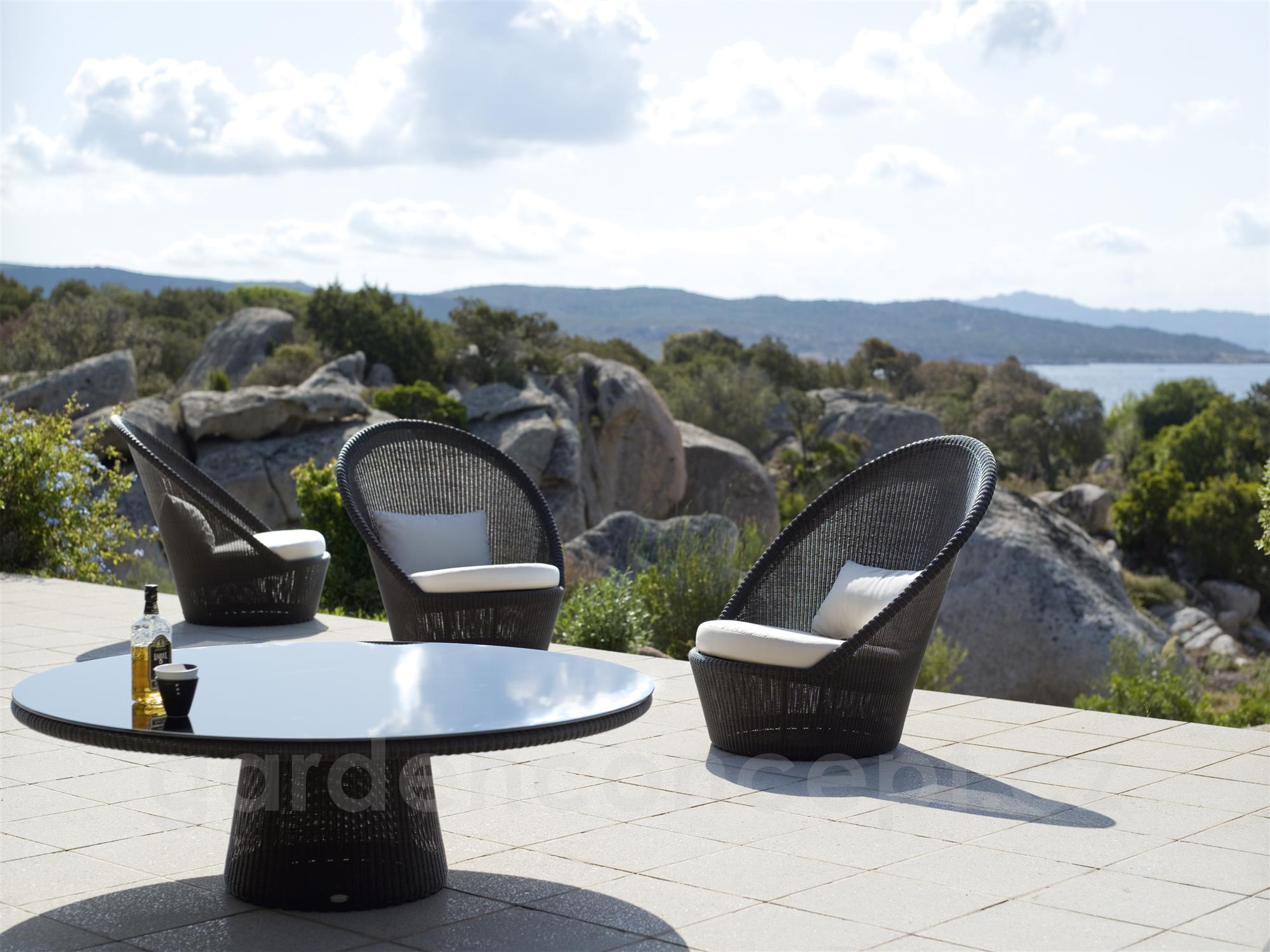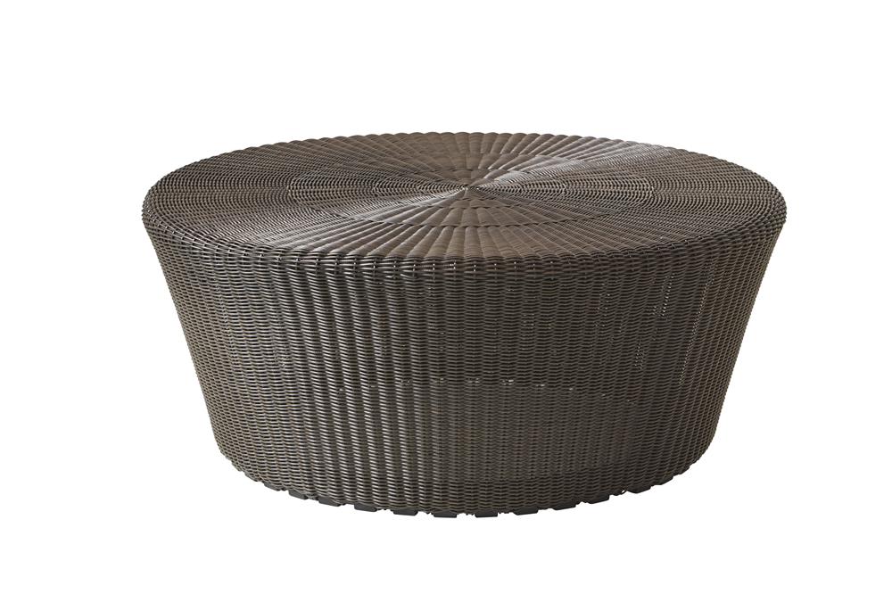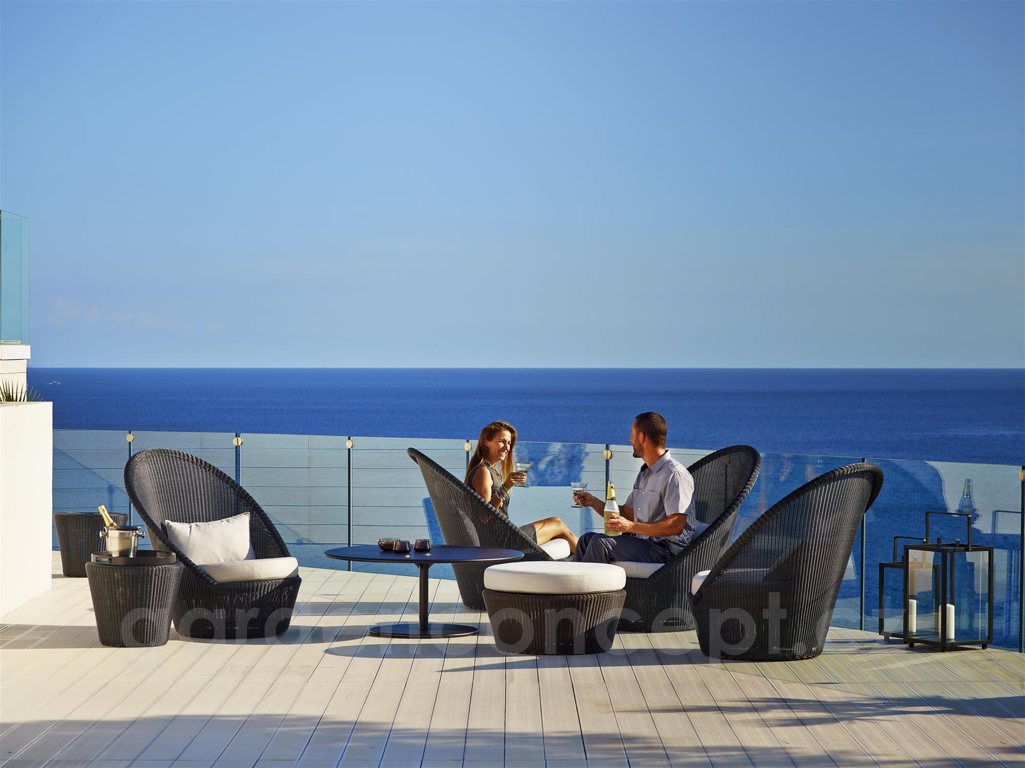 Kolekce venkovního nábytku z umělého ratanu Kingston značky Cane-line. Součástí kolekce je zahradní stohovatelné nízké křeslo, stohovatelná dvoumístná pohovka, nízké křeslo s vysokým opěrákem, podnožka a odkládací stolek.