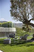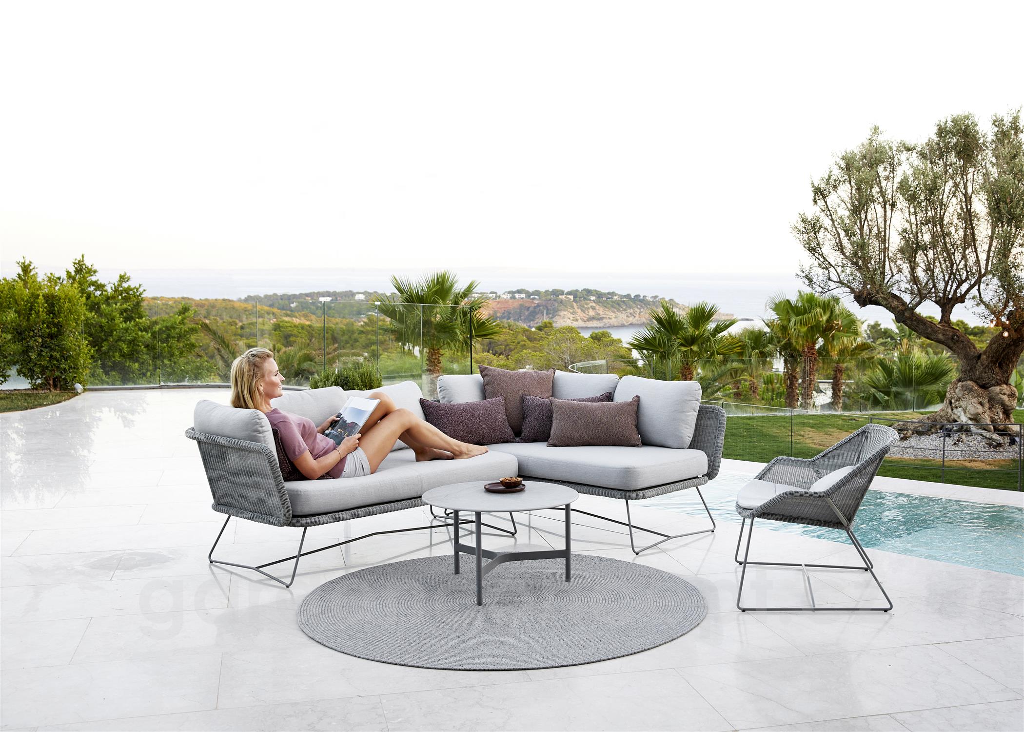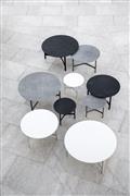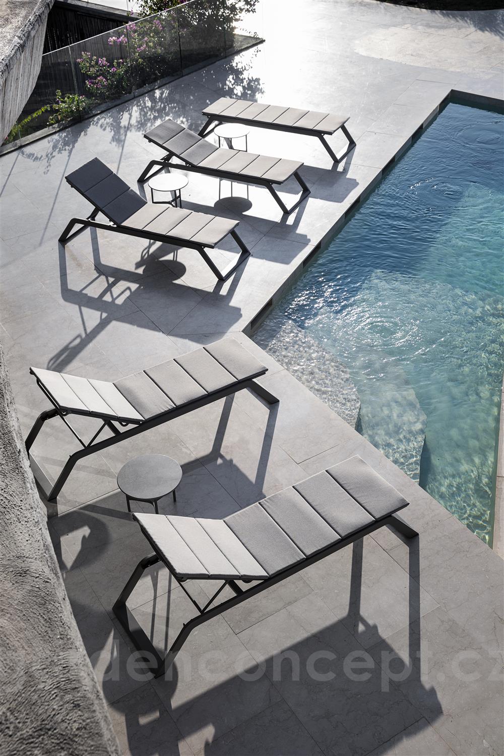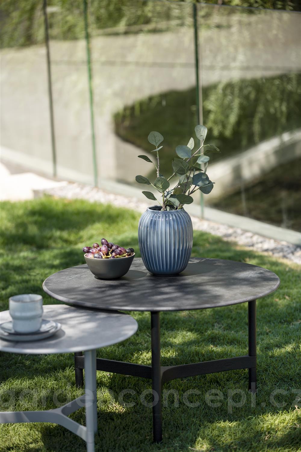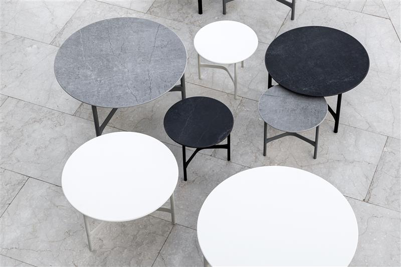 Odkládací stolky ve venkovní kvalitě. Na výběr z několka stolových desek - kamenné. HPL, keramické.