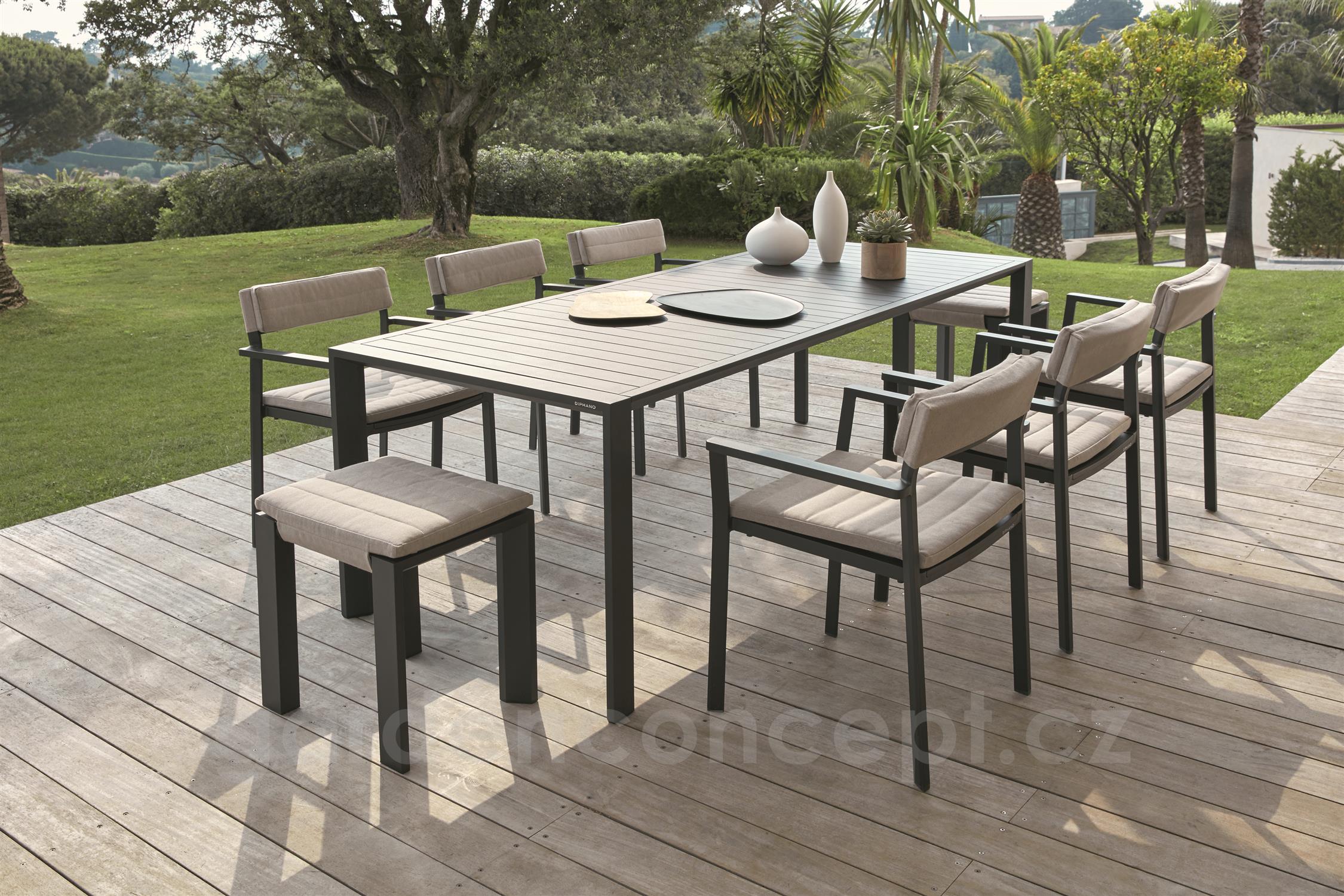 Kolekce jídelního zahradního nábytku z hliníku.