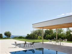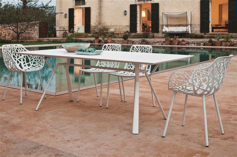 Hliníková kolekce jídelních zahradních stolů Radice Quadra značky Fast. Kolekce Radice Quadra obsahuje jídelní stoly v několika rozměrech. Rám stolu i deska stolu jsou z lakovaného hliníku. Jeden rozměr stolu nabízí také desku z masivního teakového dřeva.