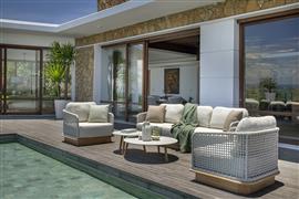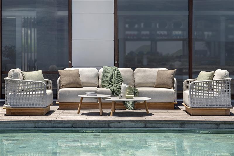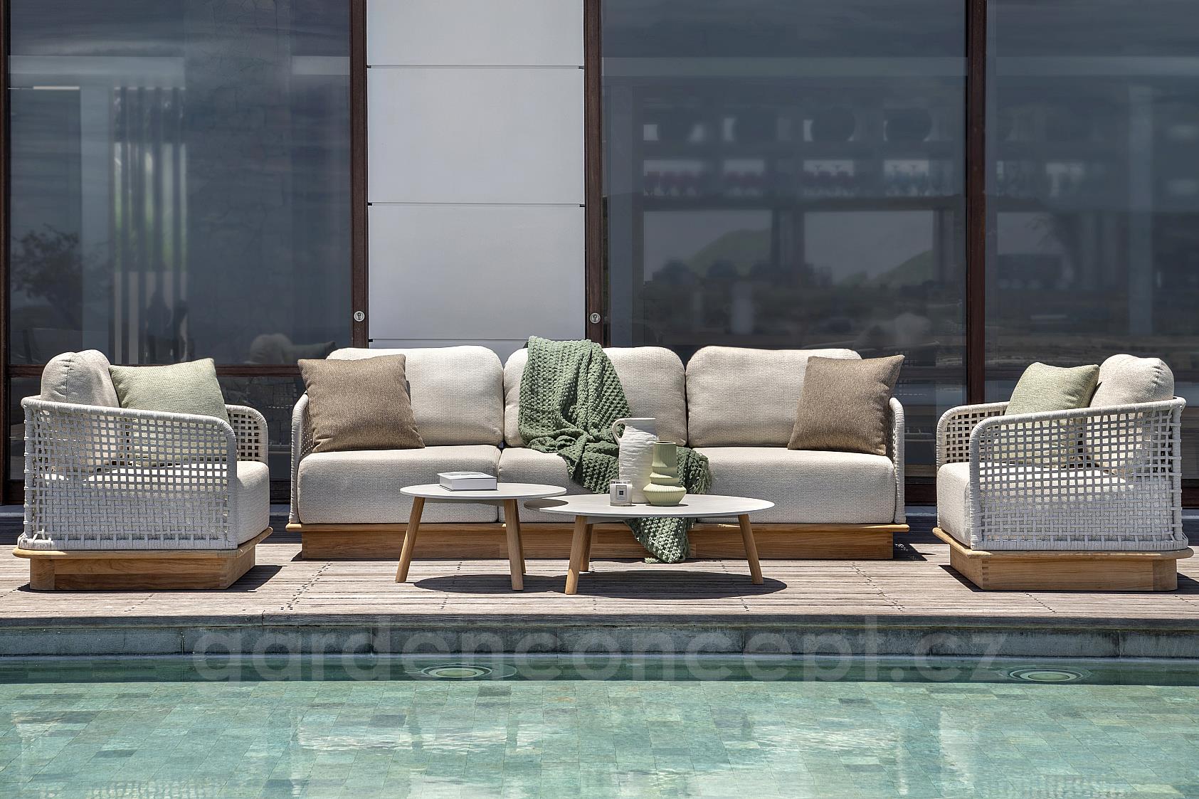 Venkovní teaková sedací sestava z kolekce Acri od belgické značky Jati Kebon.