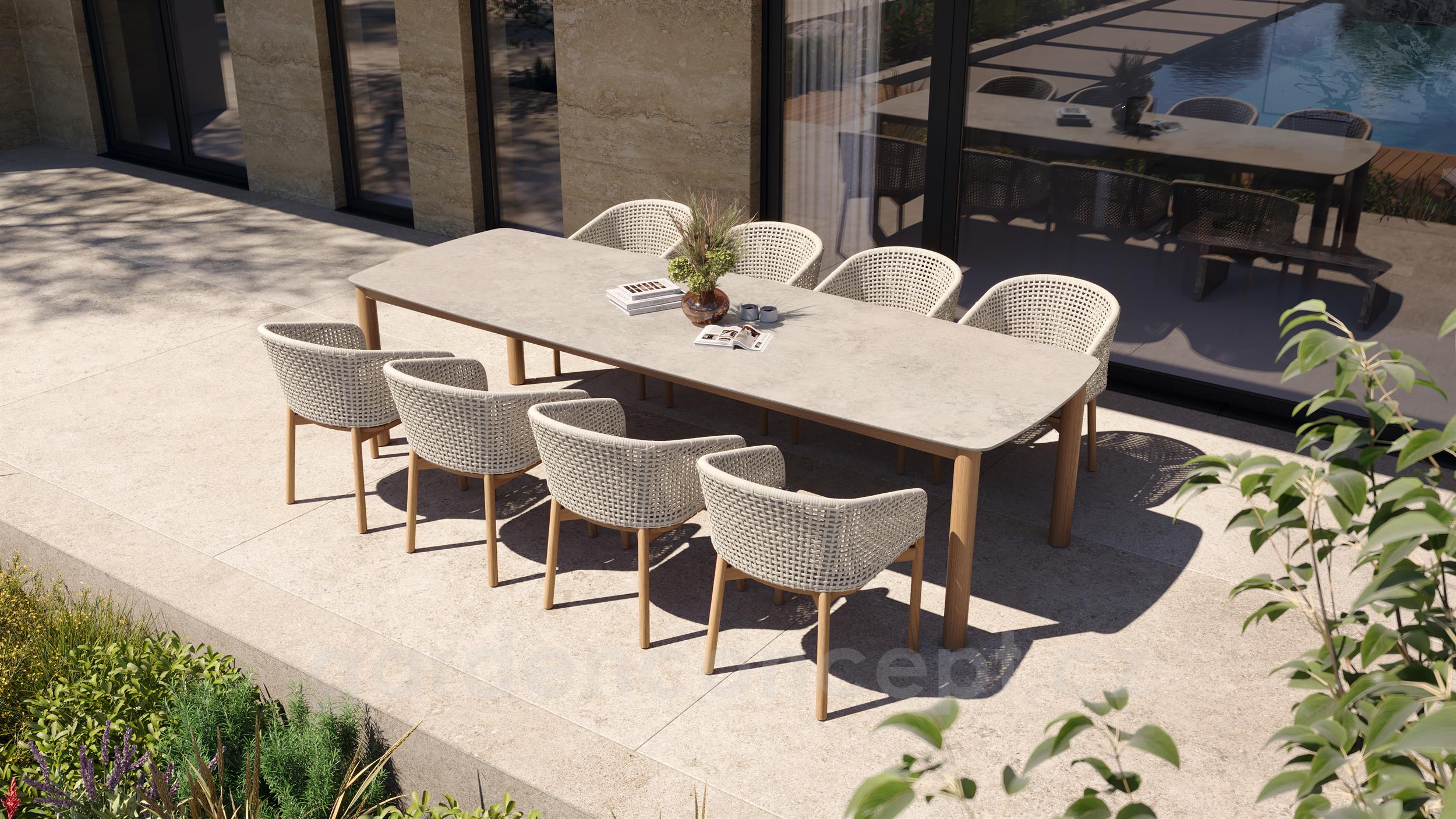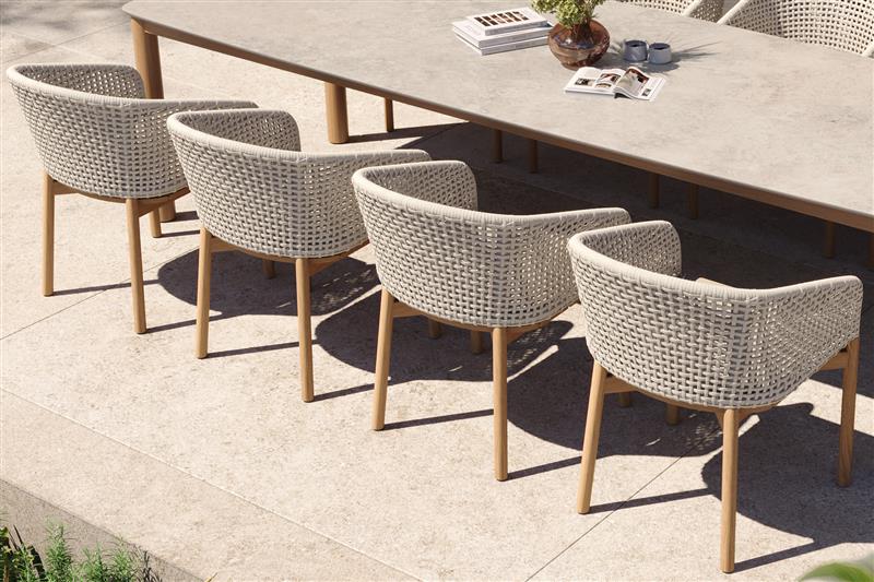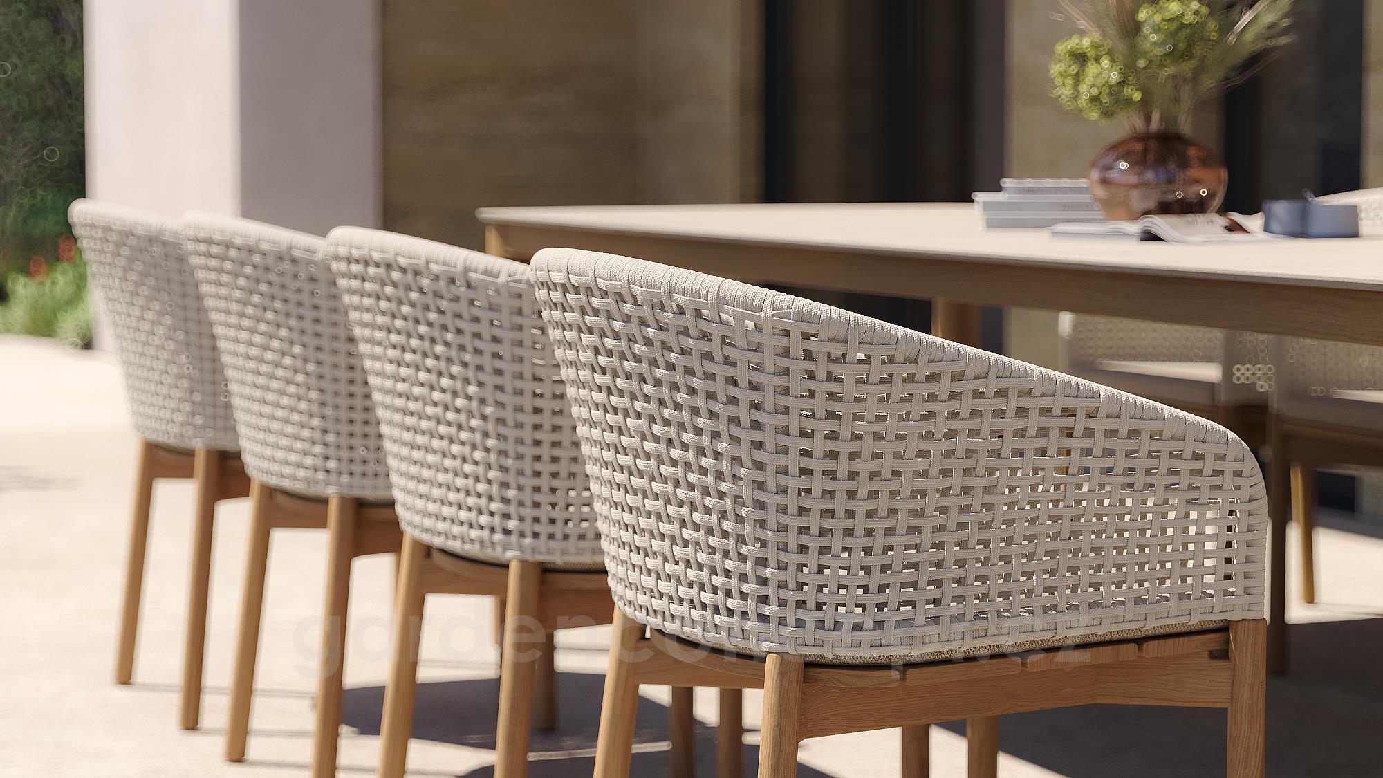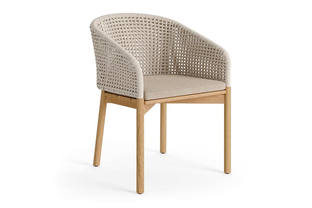 Venkovní teakové jídelní křeslo s lankovým výpletem.