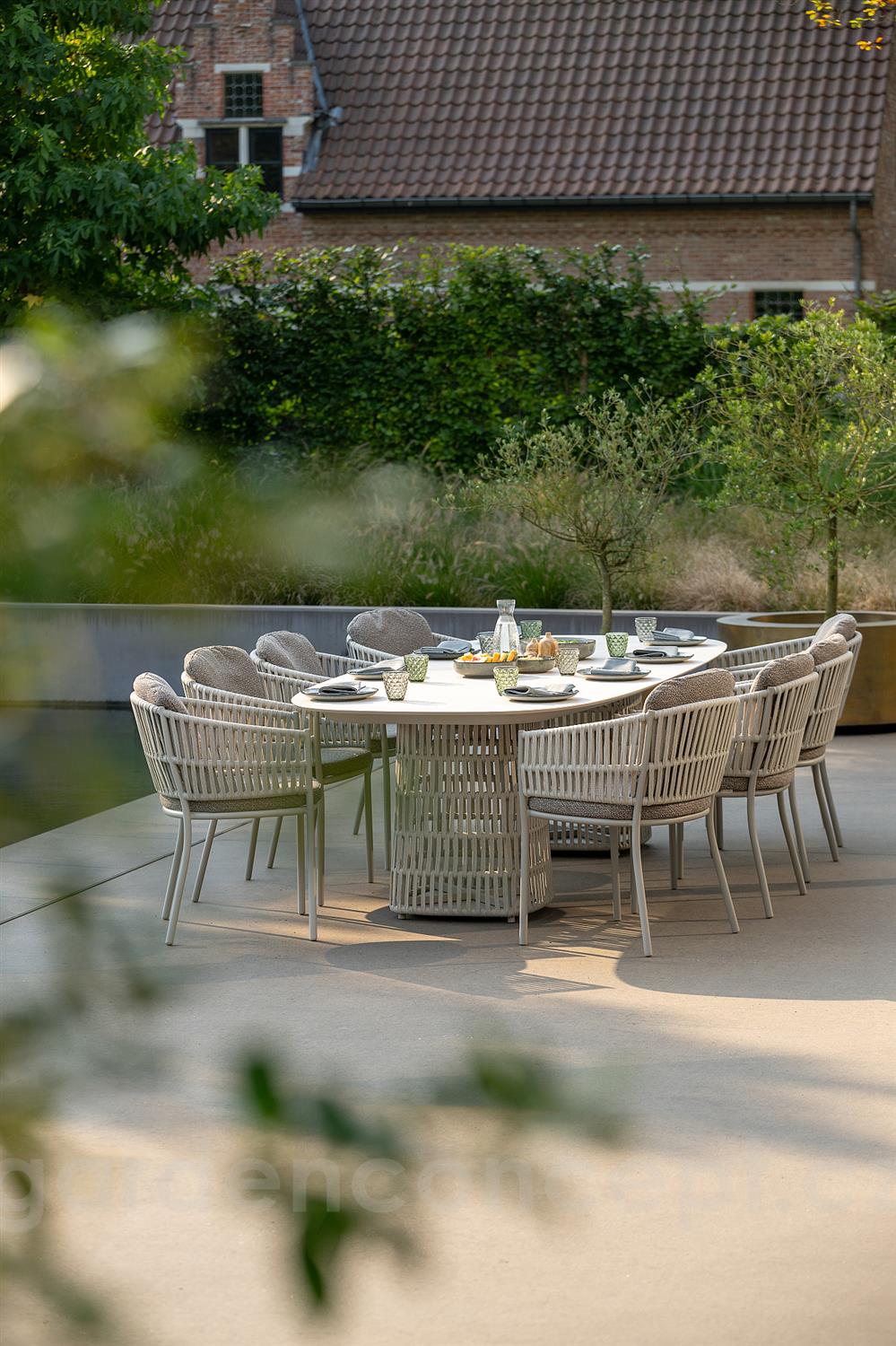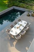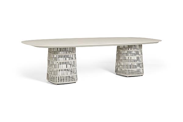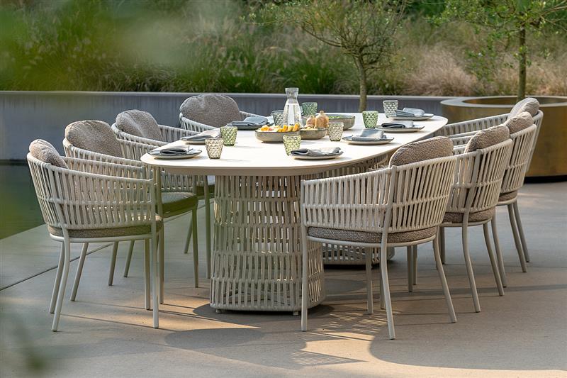 Venkovní designová jídelní sestava s páskovým výpletem.