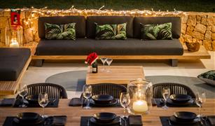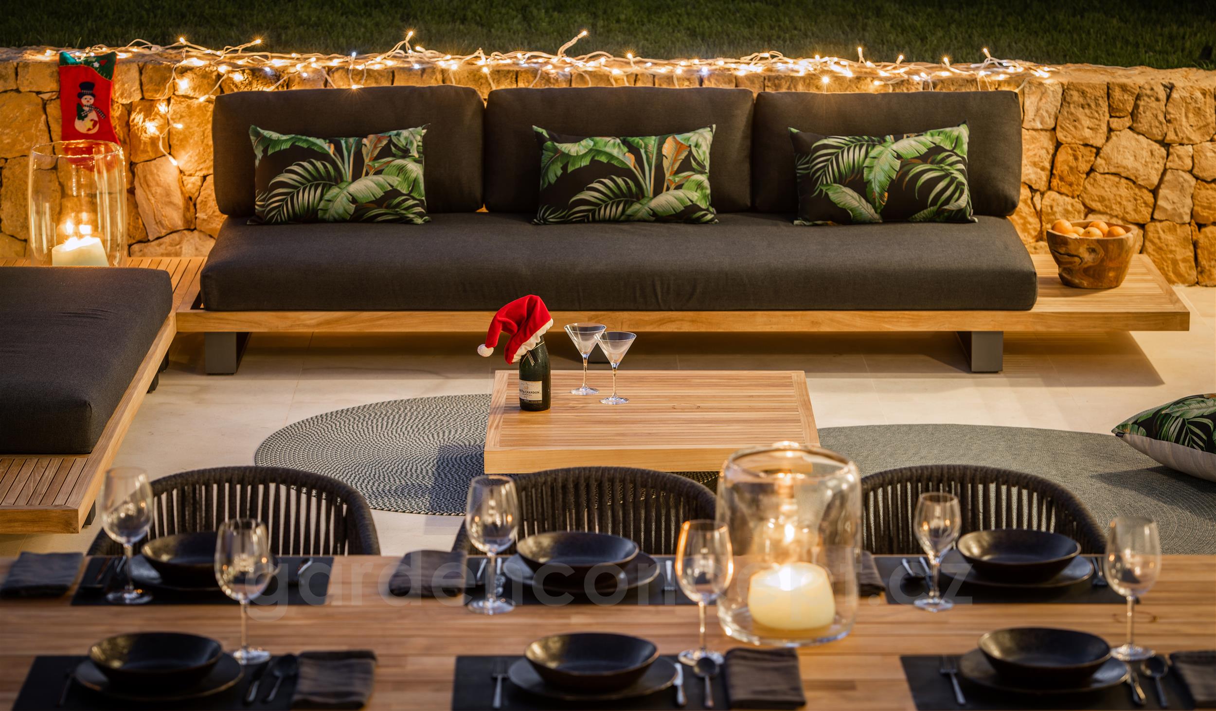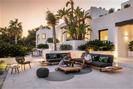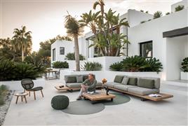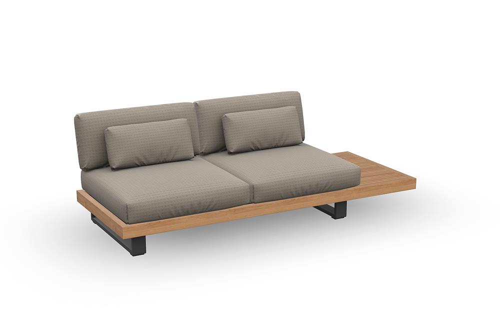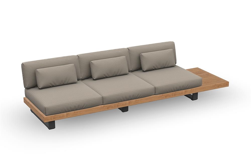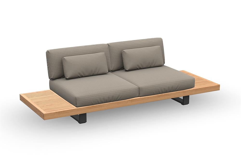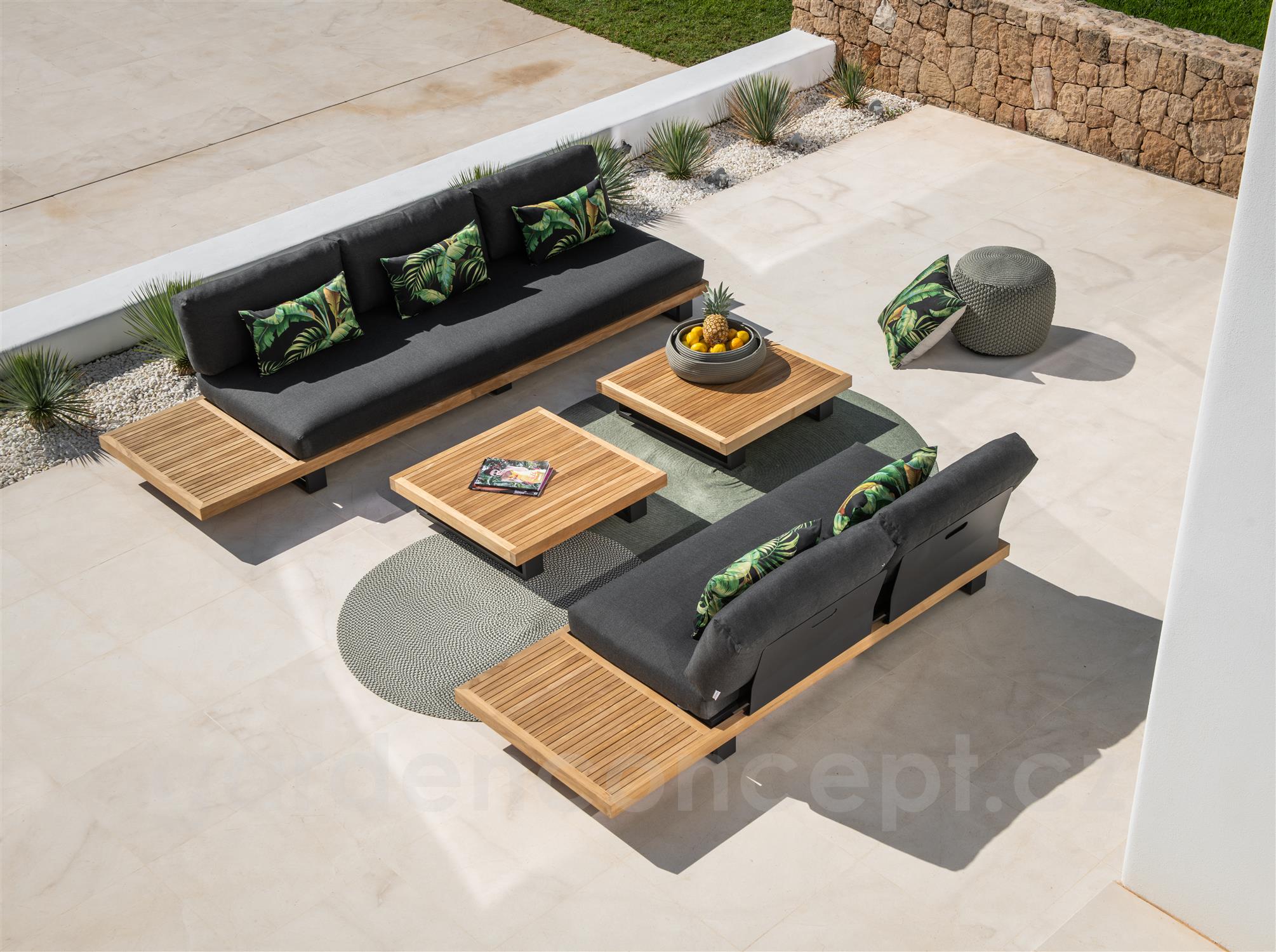 Designová venkovní sedací sestava s teakovou platformou a trvale venkovními sedáky. Sedací sestava je částečně modulová, lze kombinovat různé díly.