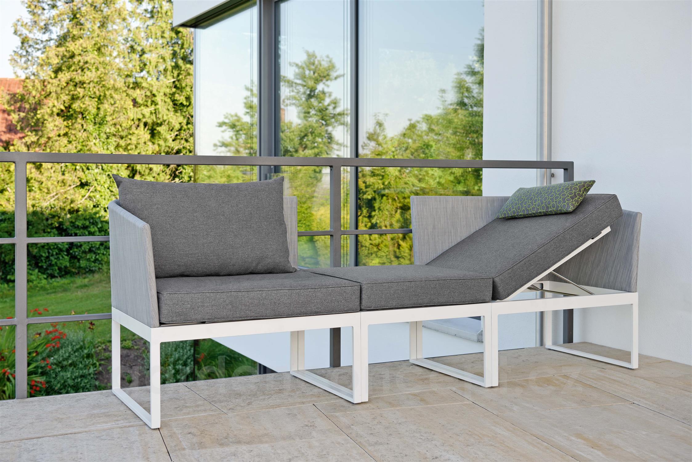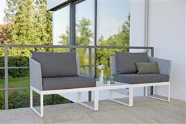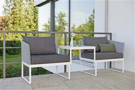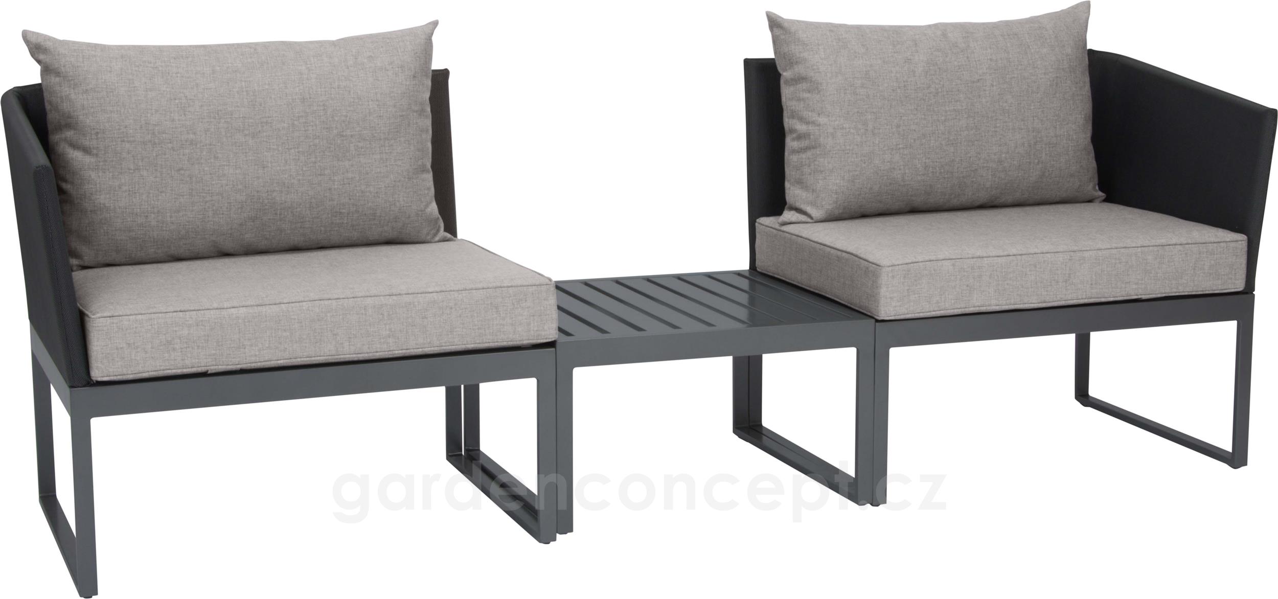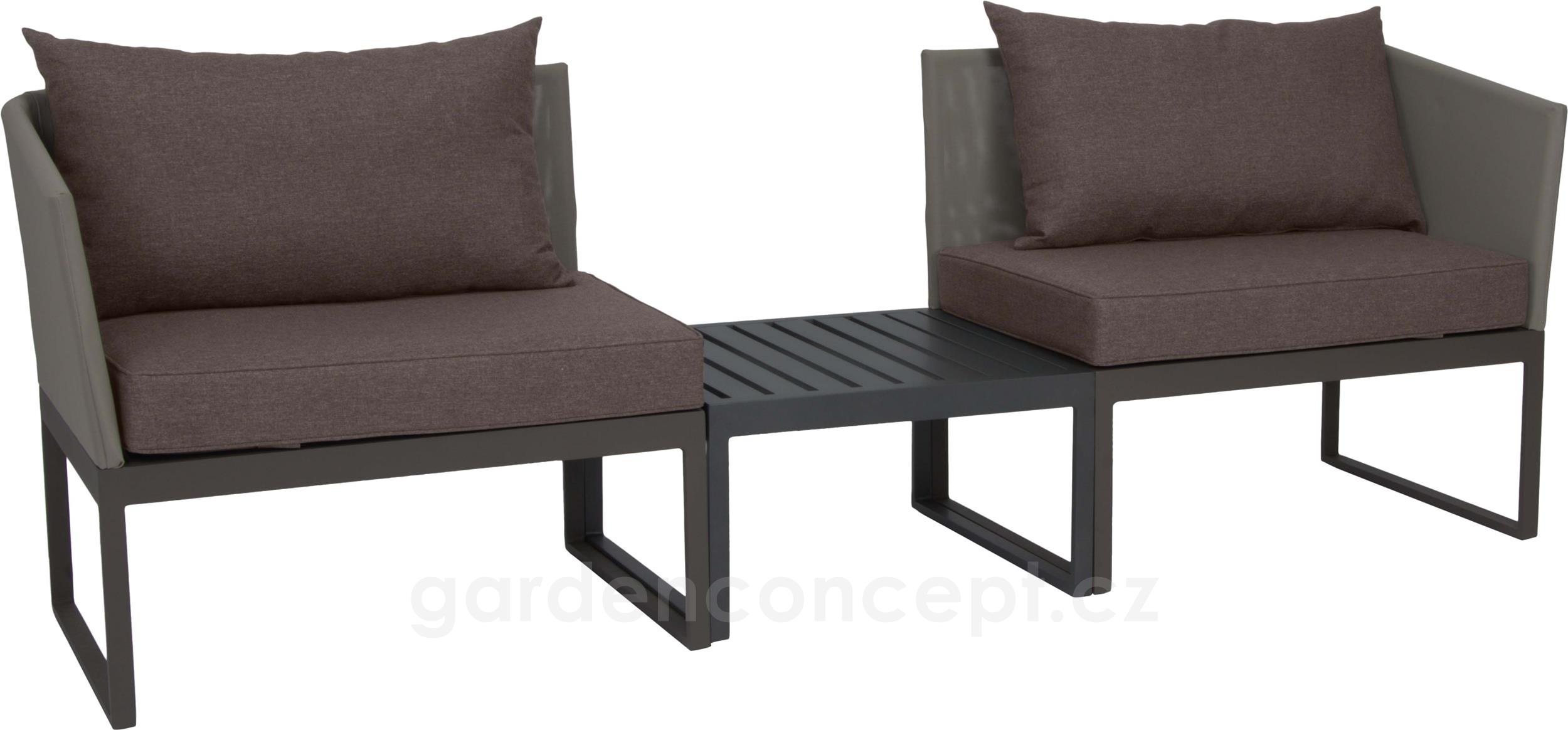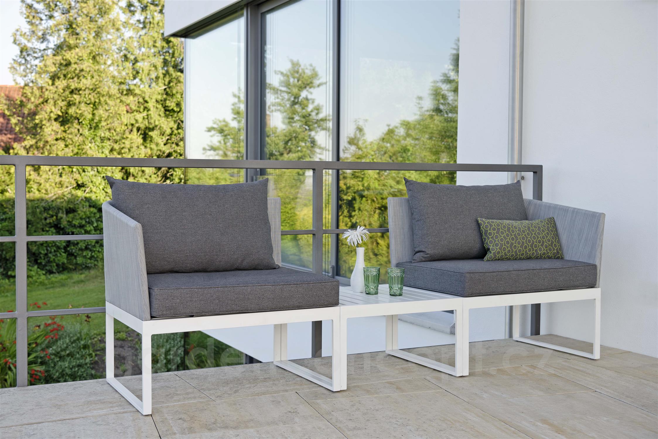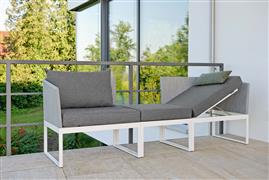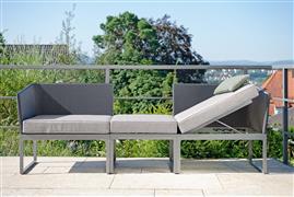 Z variabilní sedací sestavy můžete sestavit: lehátko (s polohováním zad), kávový set (zahradní křesílka se stolkem; výšku stolku lze nastavit do dvou výšek), rohovou sedací sestavu s podnožkou nebo 2-místnou pohovku. Svými rozměry je vhodná do menších prostor.