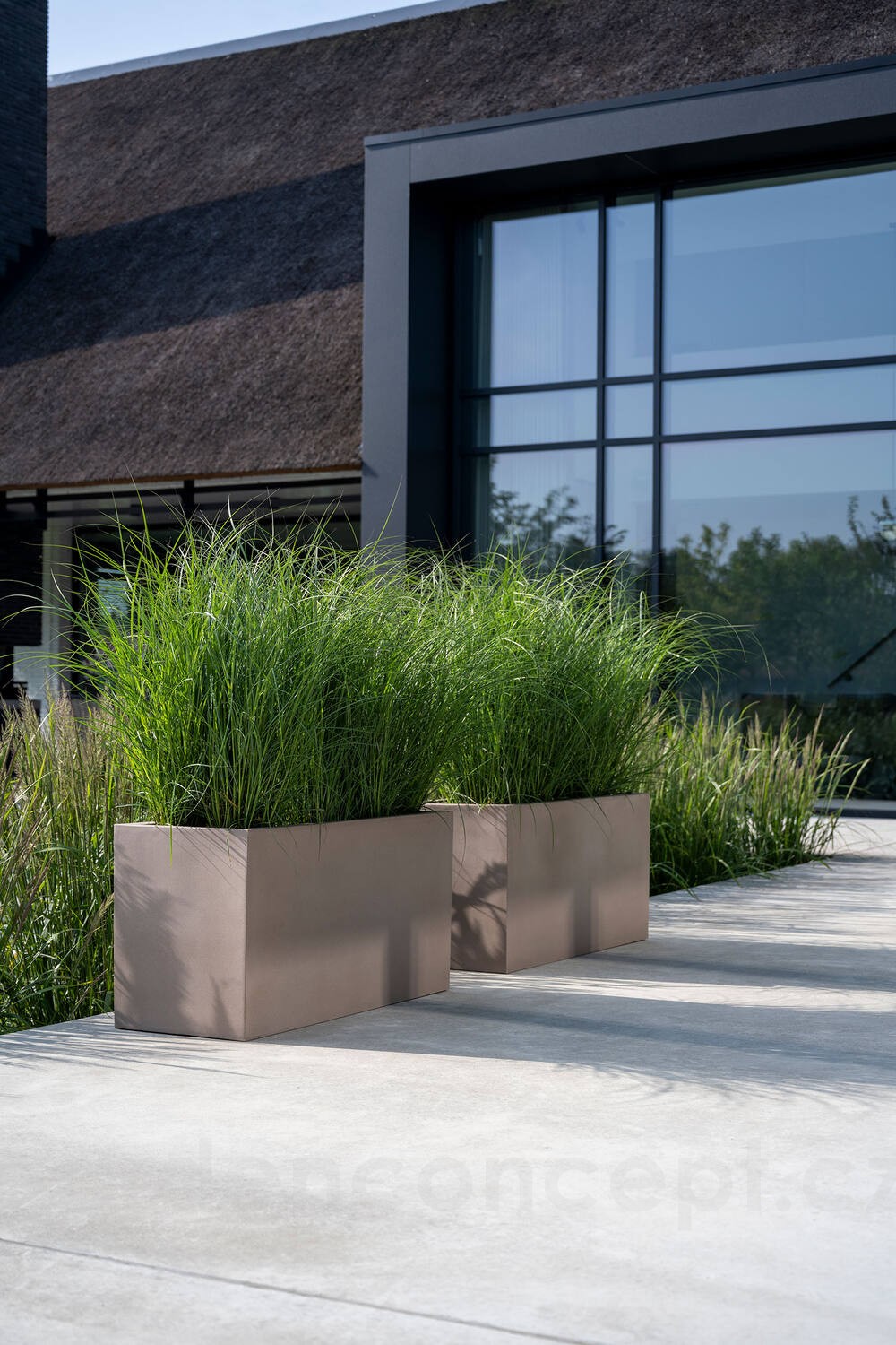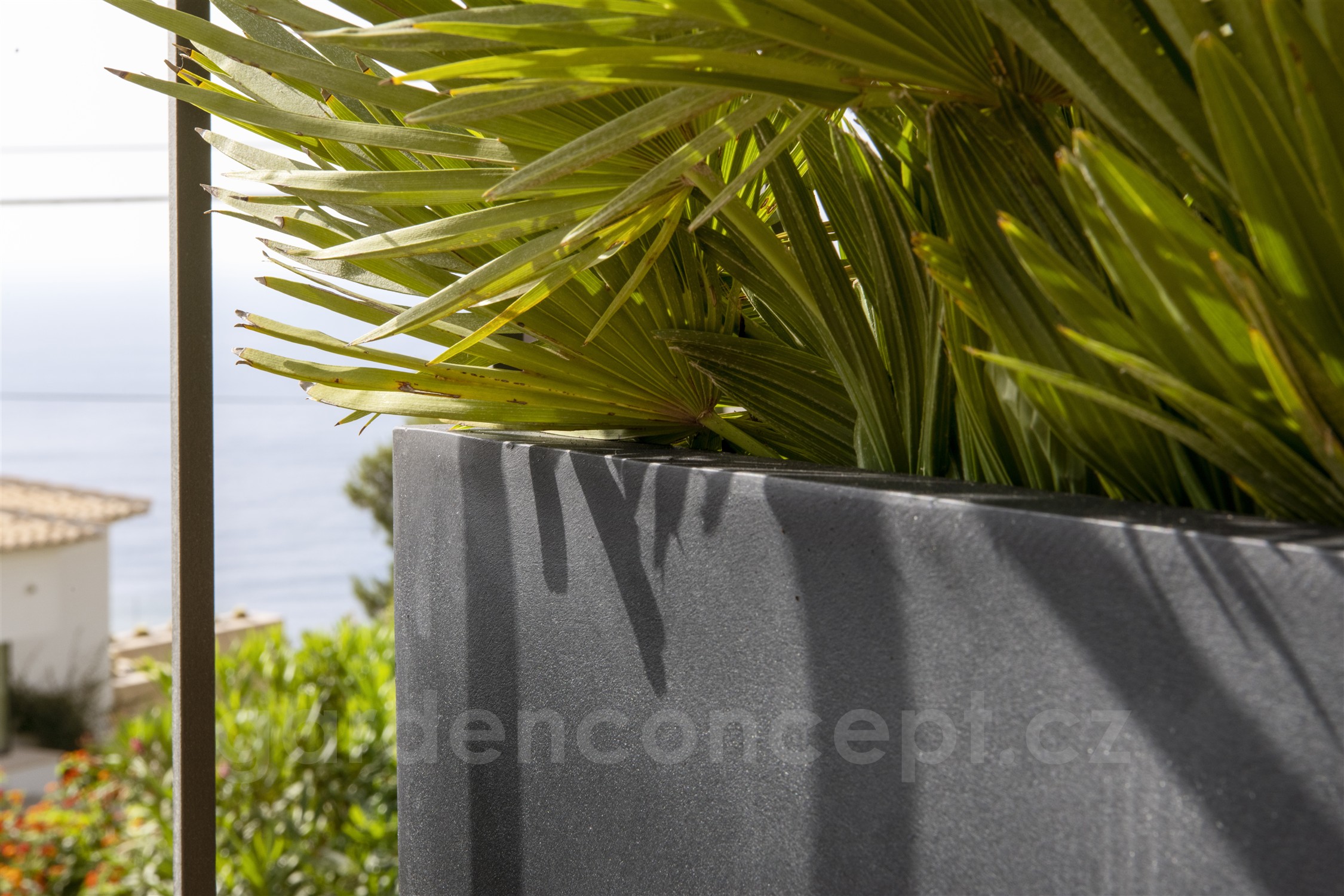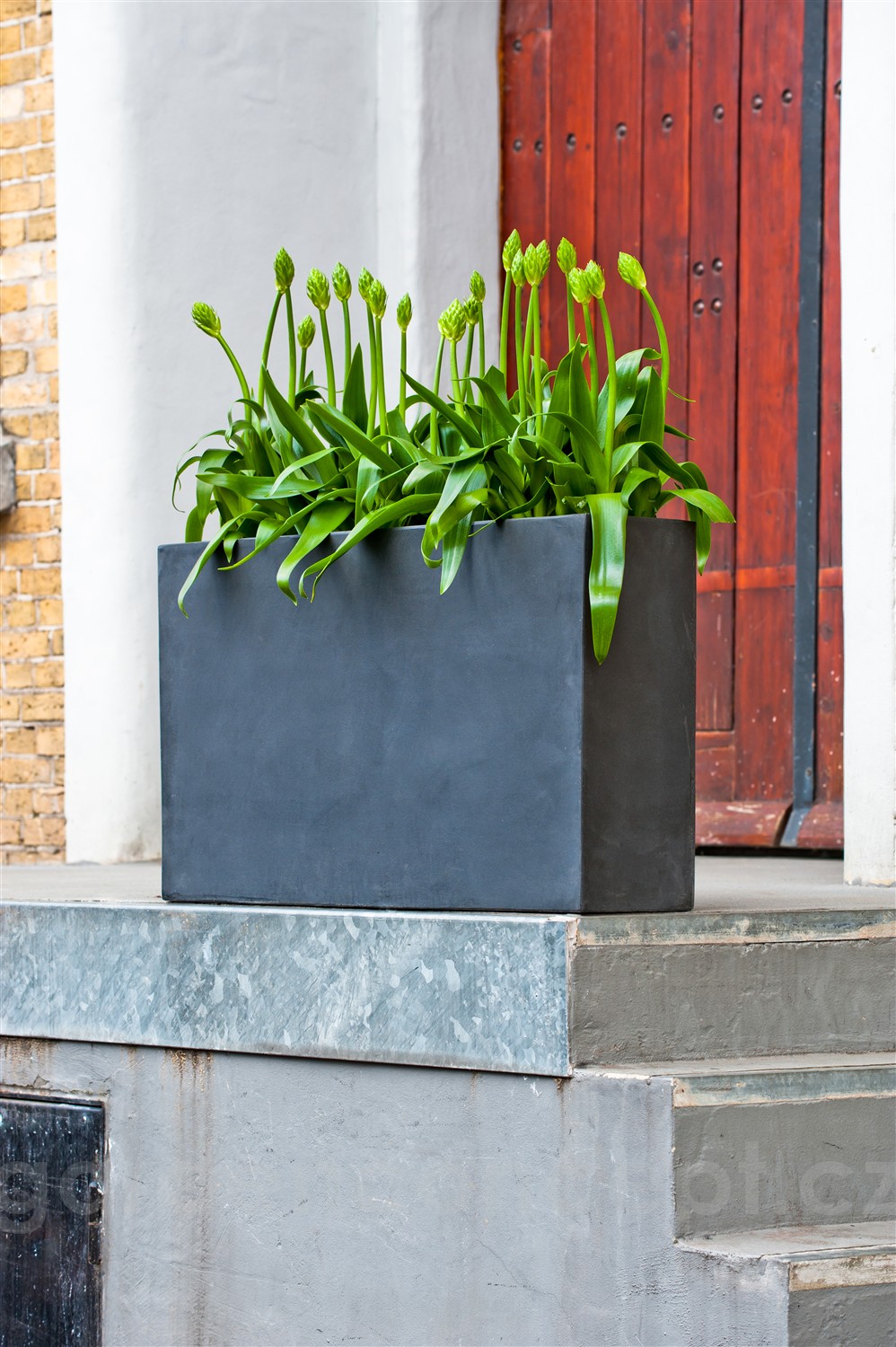 Oblíbené venkovní obdélníkové kompozitní květináče - truhlíky v různých rozměrech.