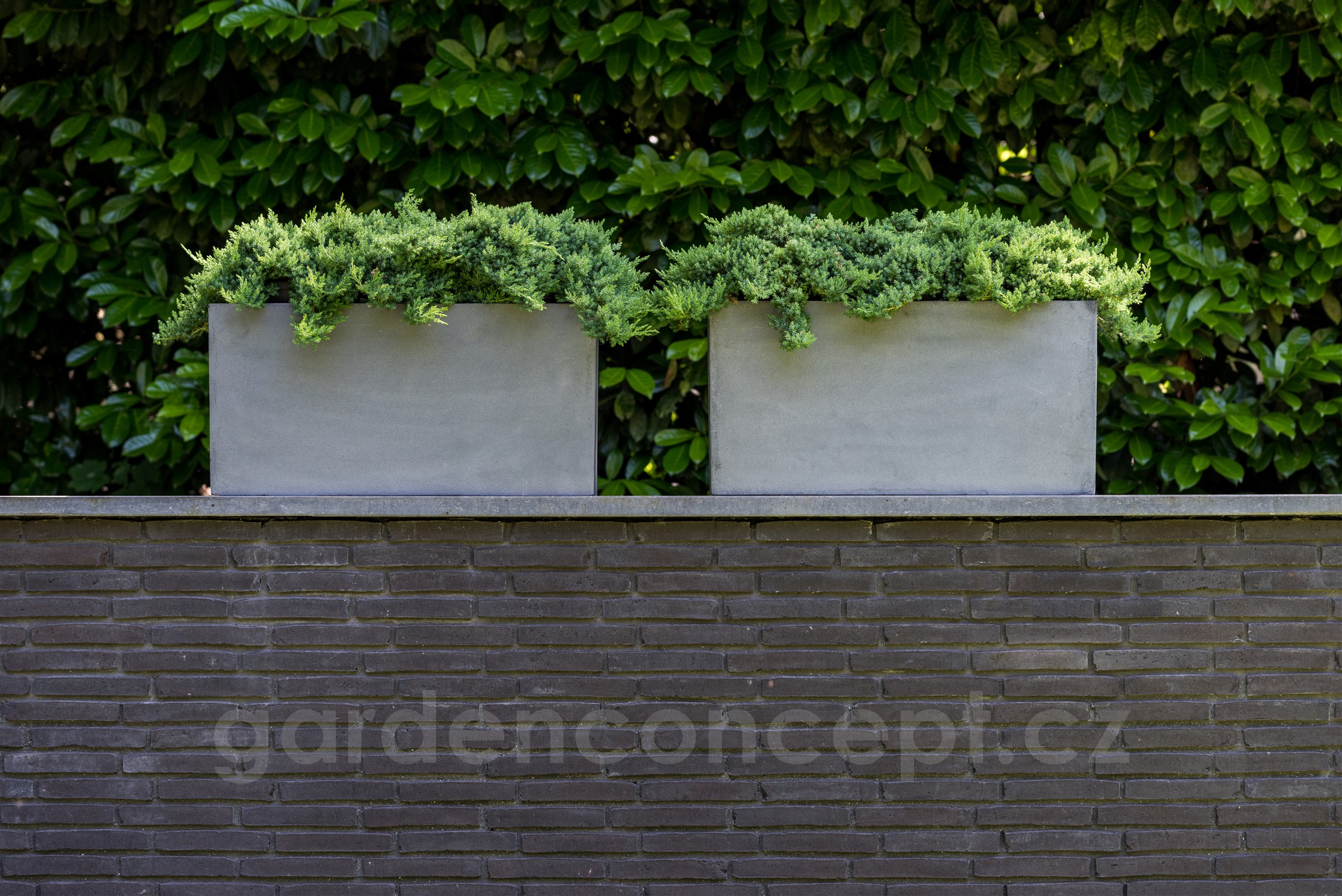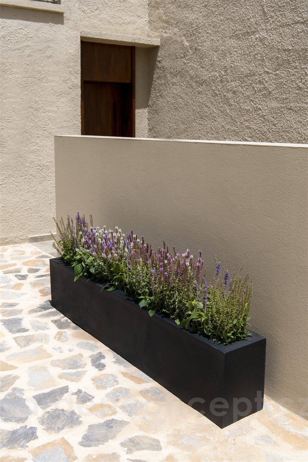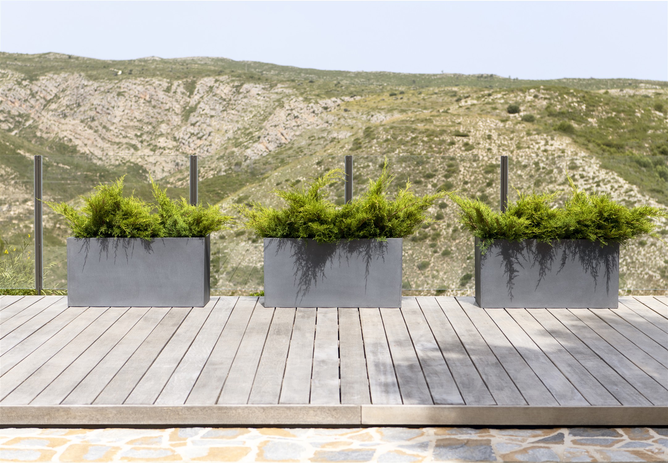 Oblíbené venkovní obdélníkové kompozitní květináče - truhlíky v různých rozměrech.