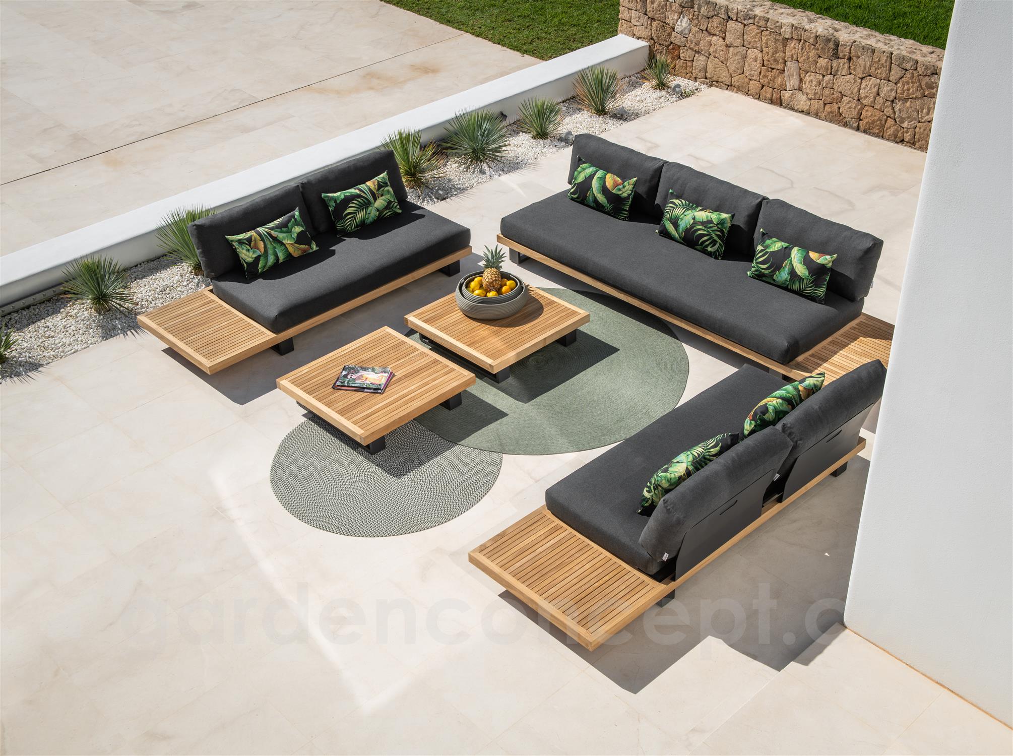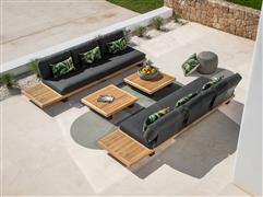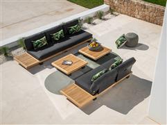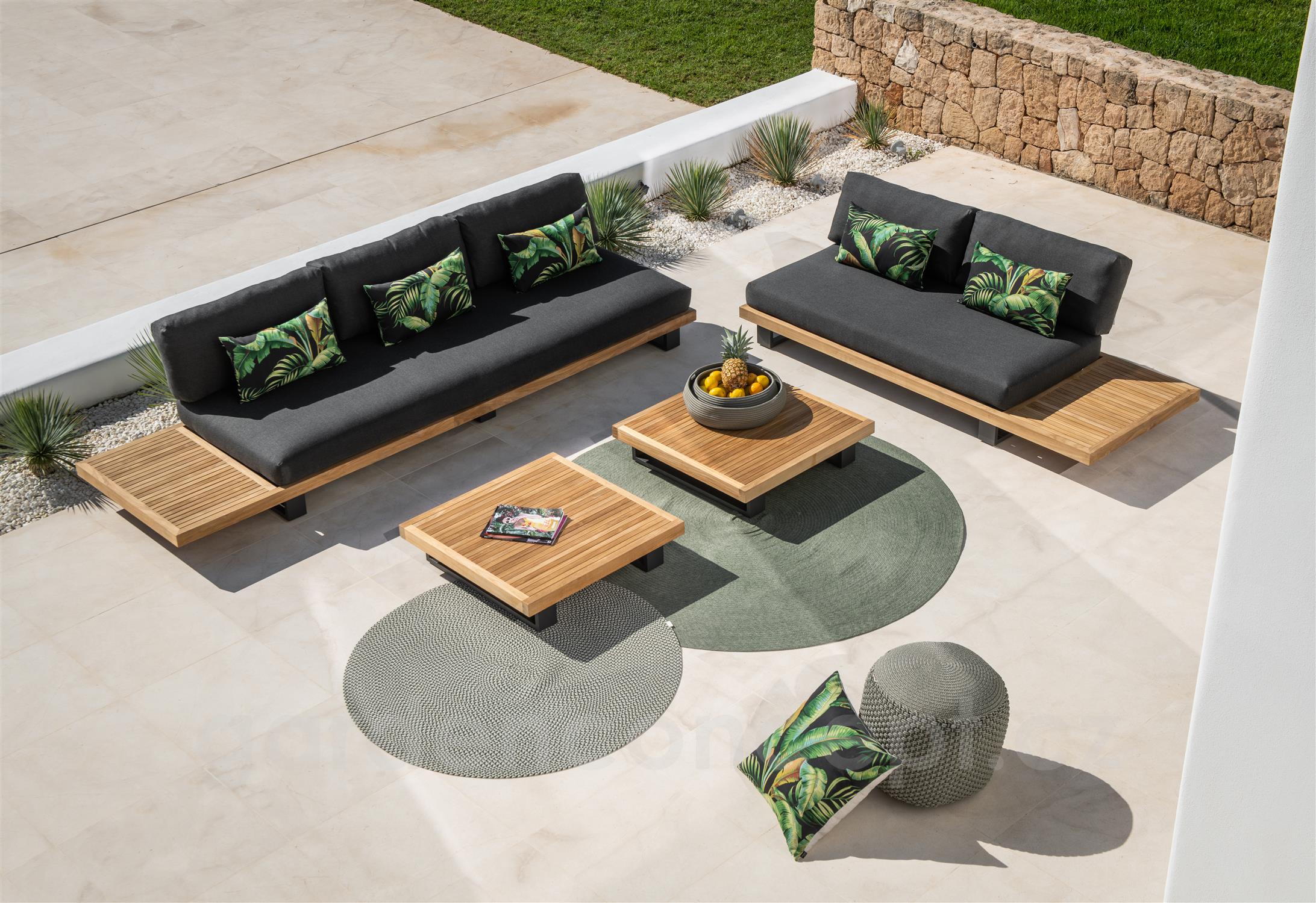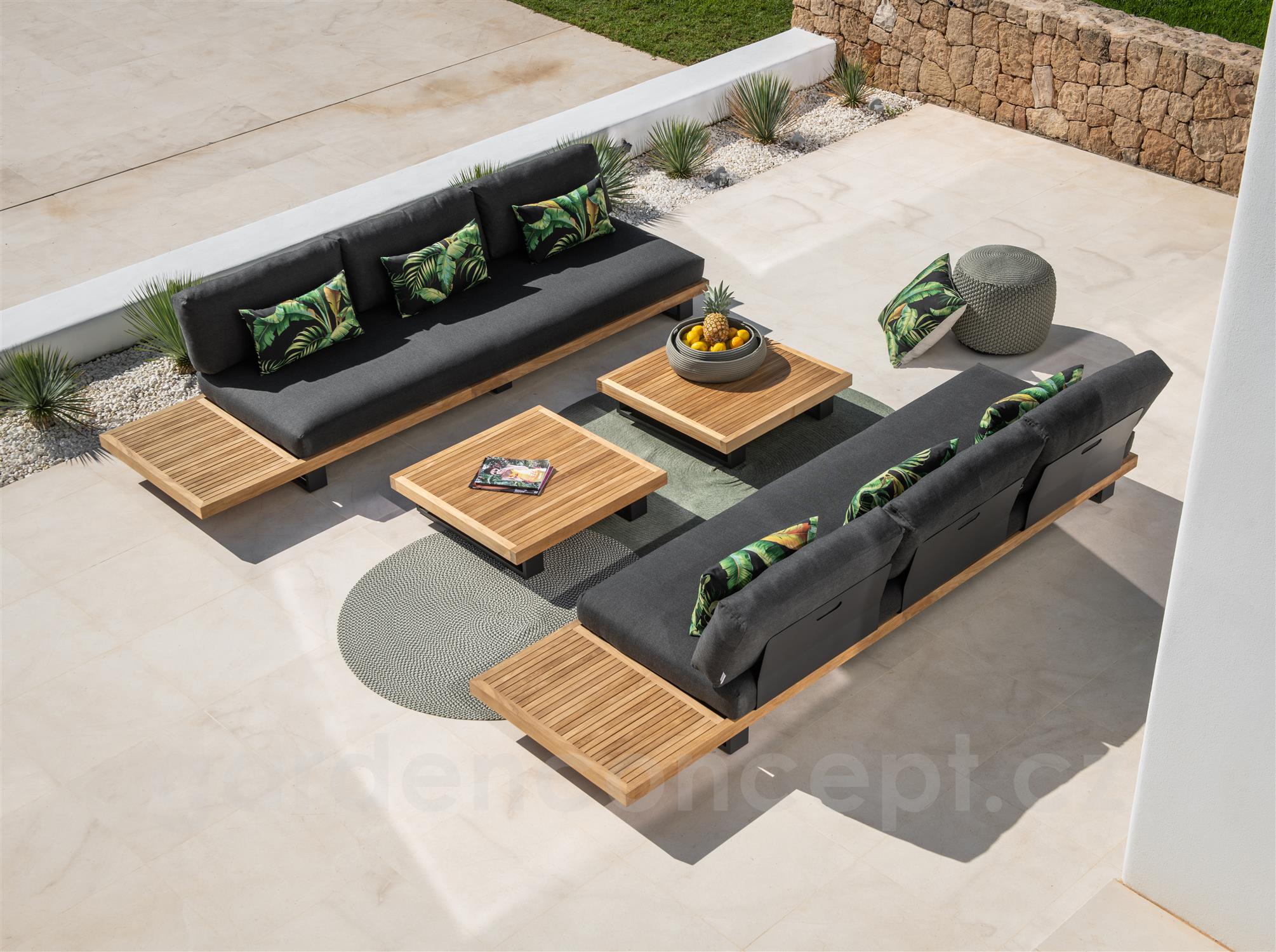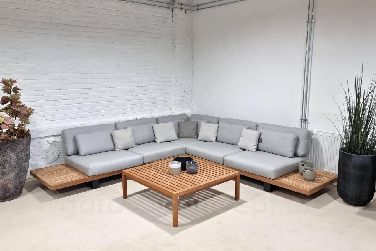 Teaková platforma, lakování rámu tmavě šedá, polstrování barva dle vzorníku, venkovní provedení sedáků.