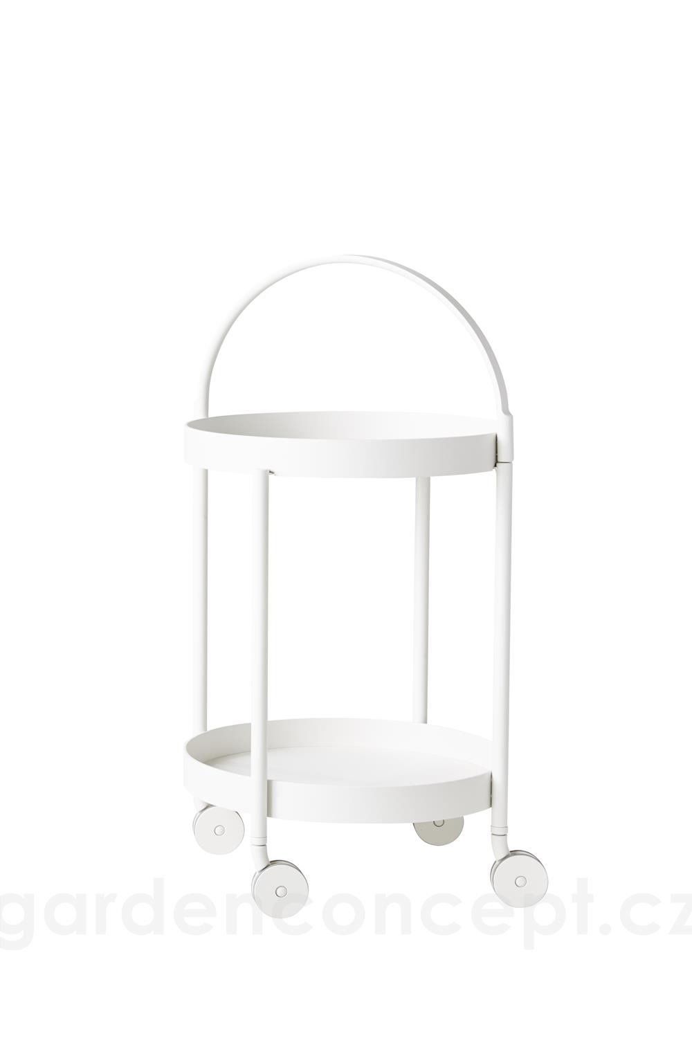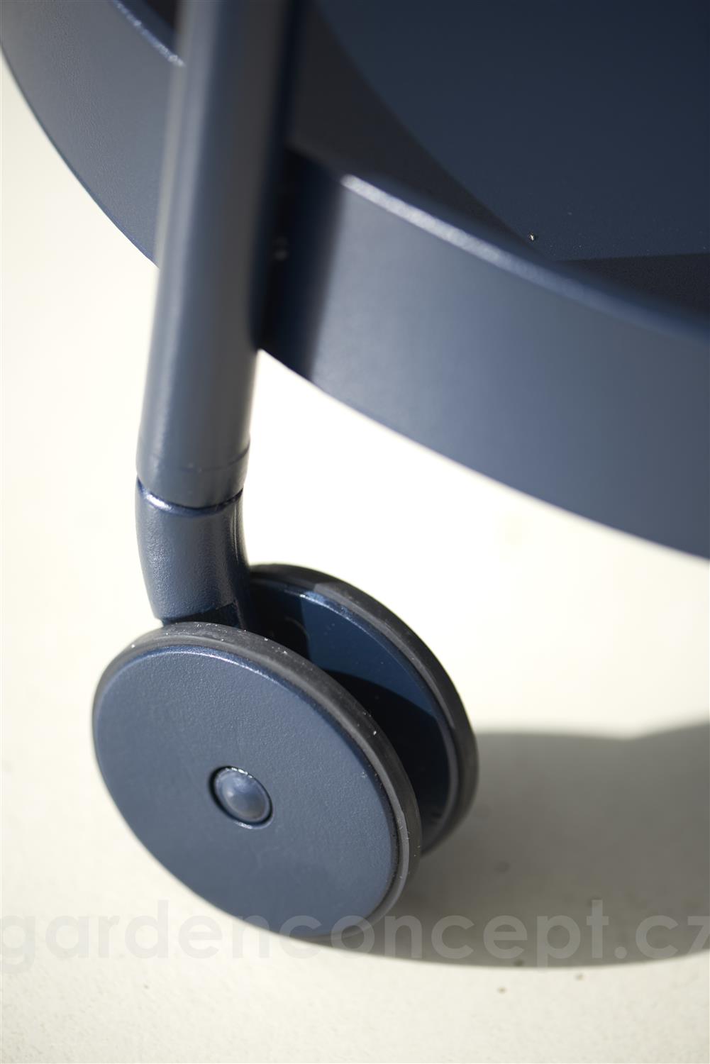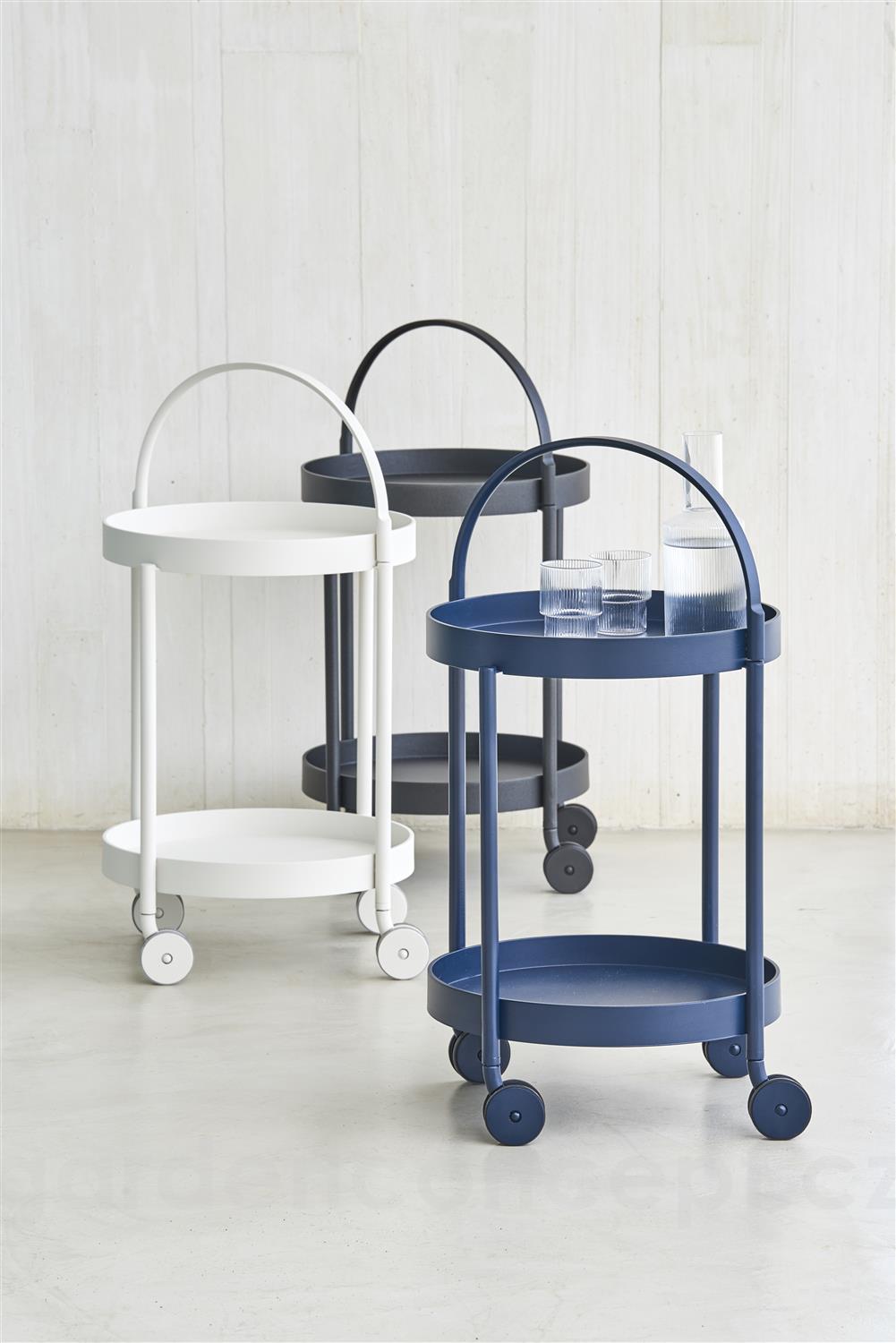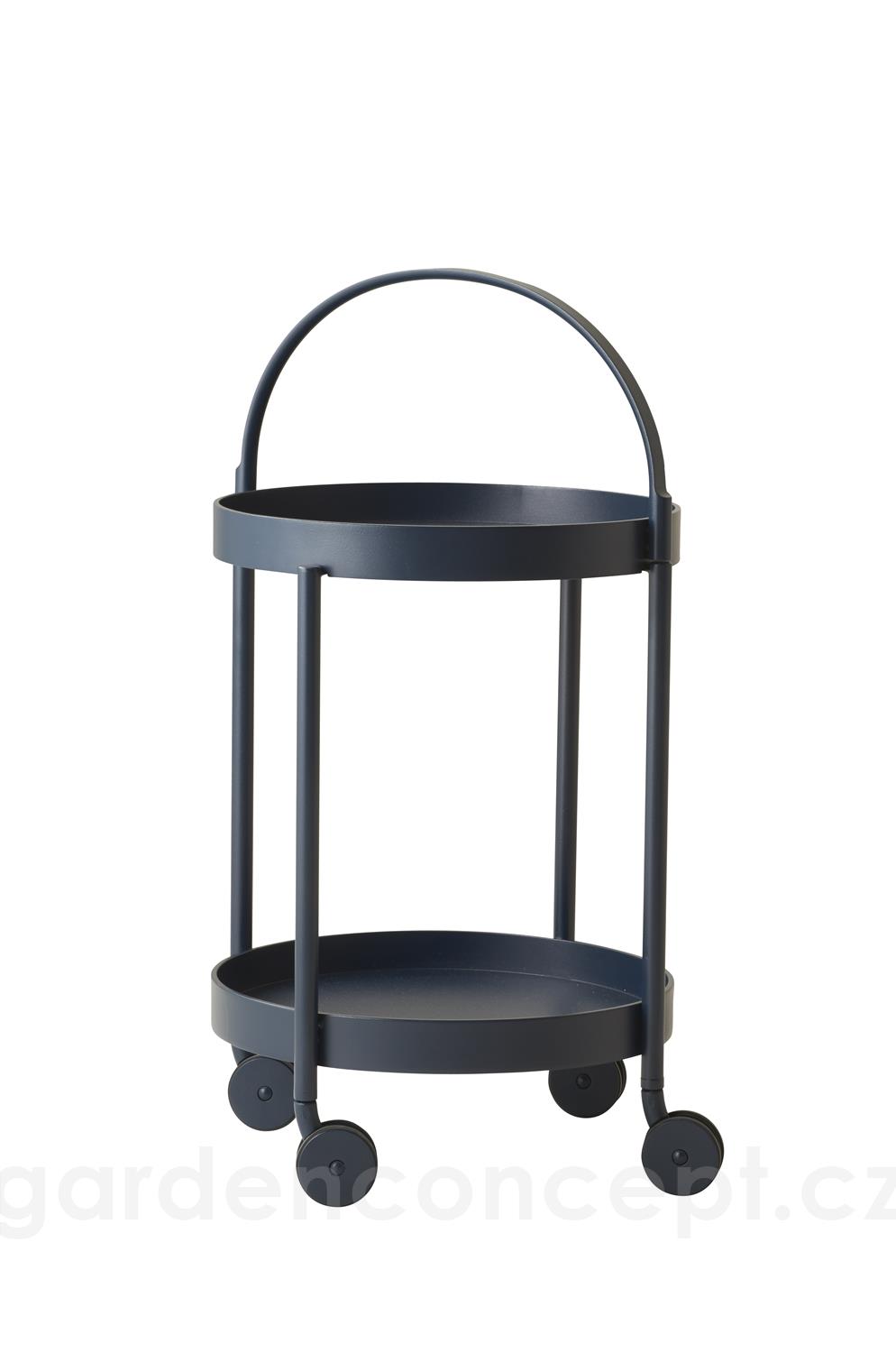 Hliníkový servírovací vozík s kolečky Rooll značky Cane-line. Konstrukce zahradního servírovacího vozíku je z lakovaného hliníku ve 3 barvách: bílá (white), tmavě šedá (lava grey), tmavě modrá (midnight blue).