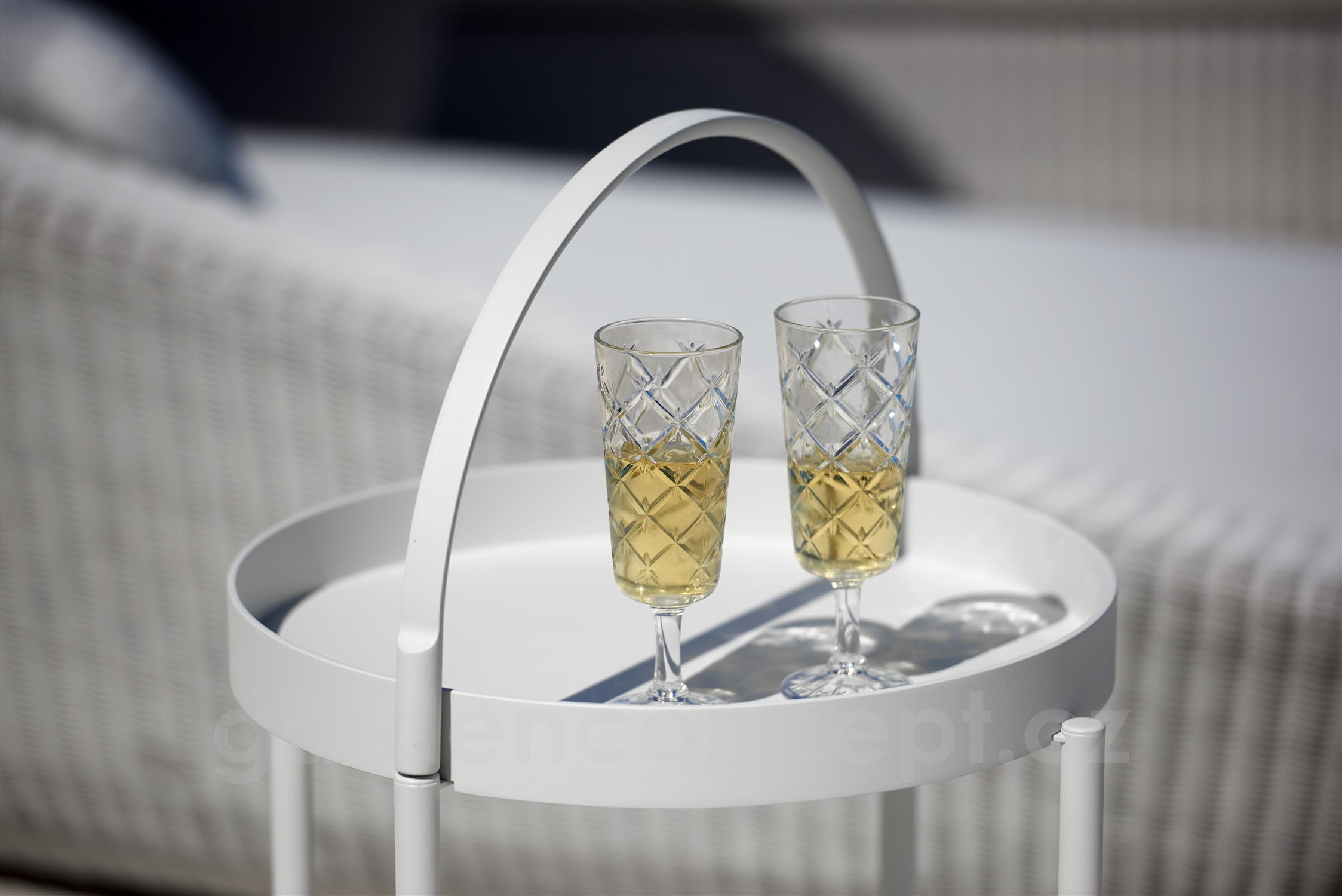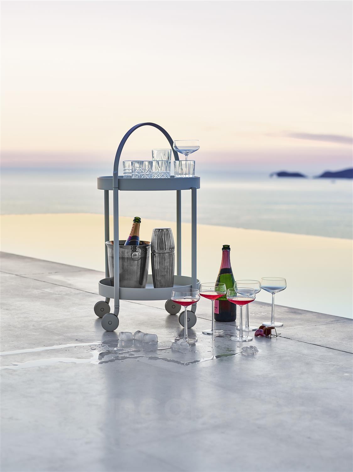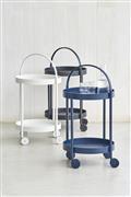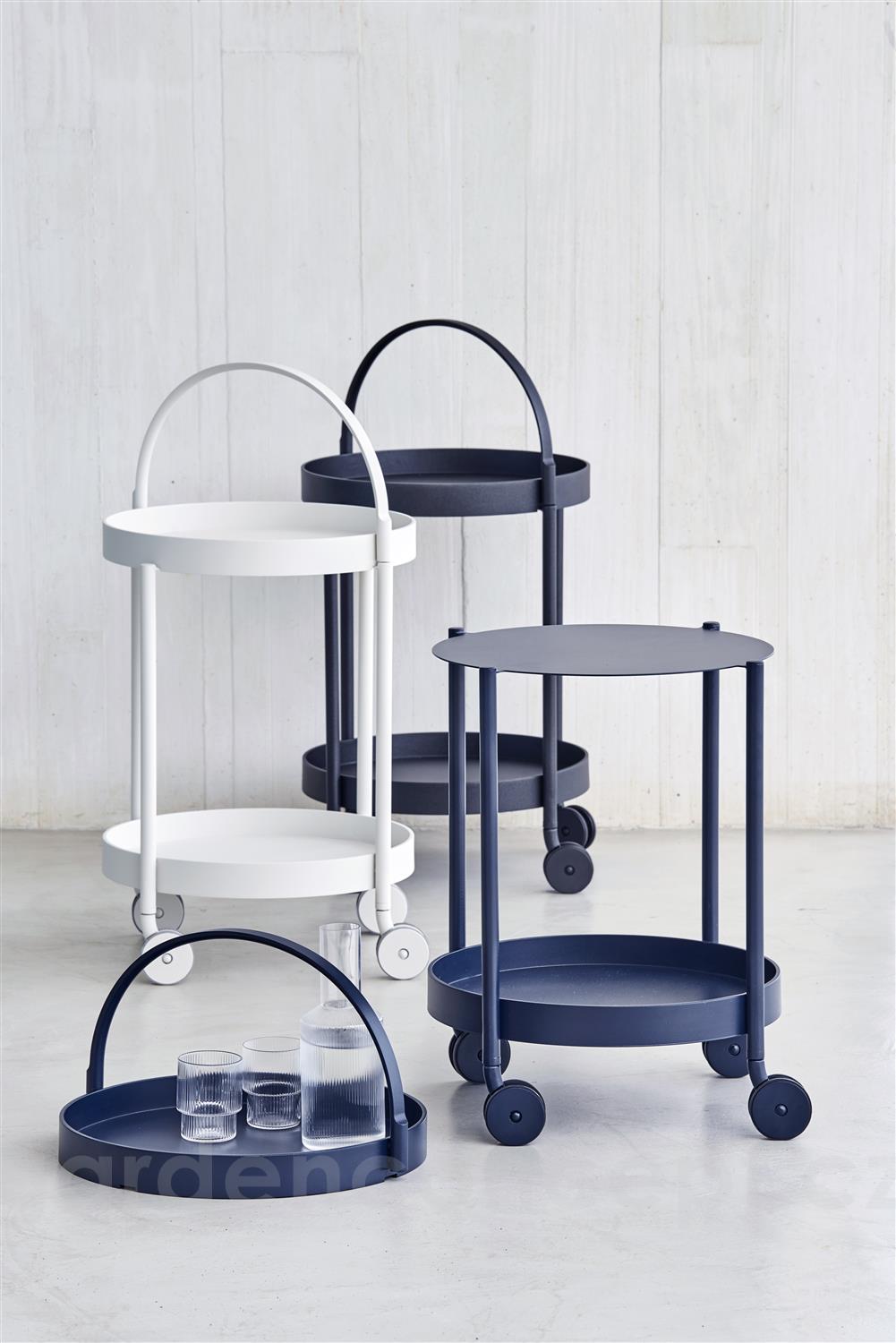 Hliníkový servírovací vozík s kolečky Rooll značky Cane-line. Konstrukce zahradního servírovacího vozíku je z lakovaného hliníku ve 3 barvách: bílá (white), tmavě šedá (lava grey), tmavě modrá (midnight blue).