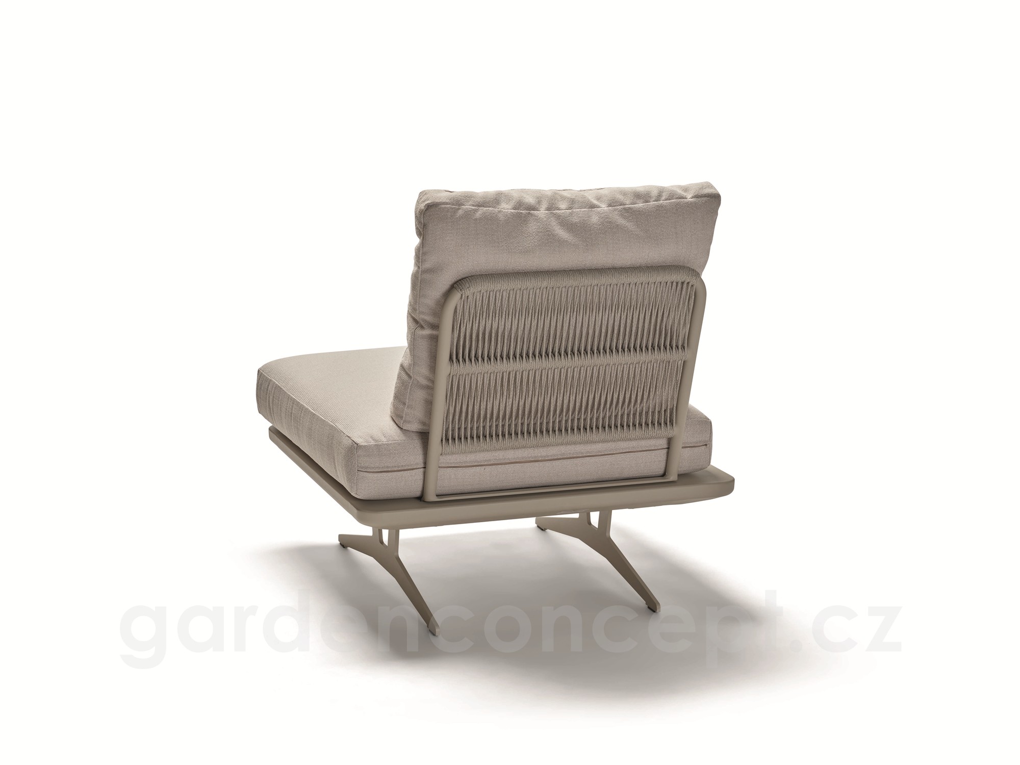 Frame: powder-coated aluminum, armrests hand-woven in rope. Dimensions: 84x95x85 cm.