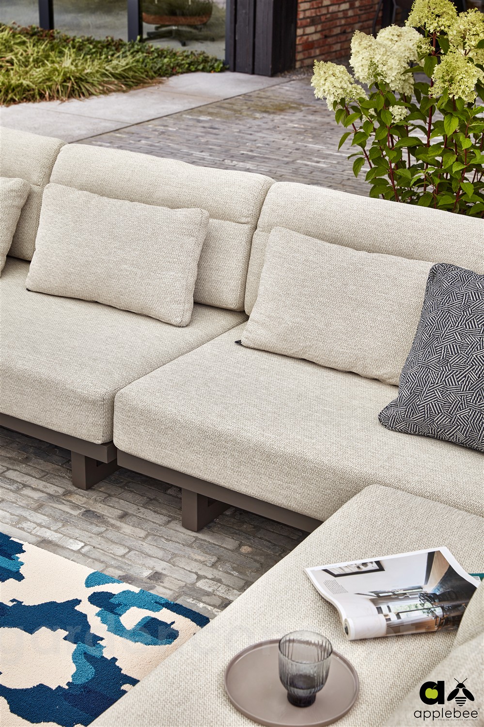 Sedák, polstrování a opěrný polštář jsou z kvalitní venkovní látky s výplní z rychleschnoucí pěny, proto může zůstat venku celoročně bez nutnosti chránit ho před deštěm.