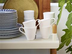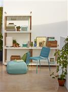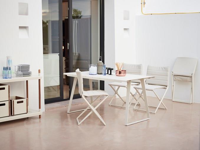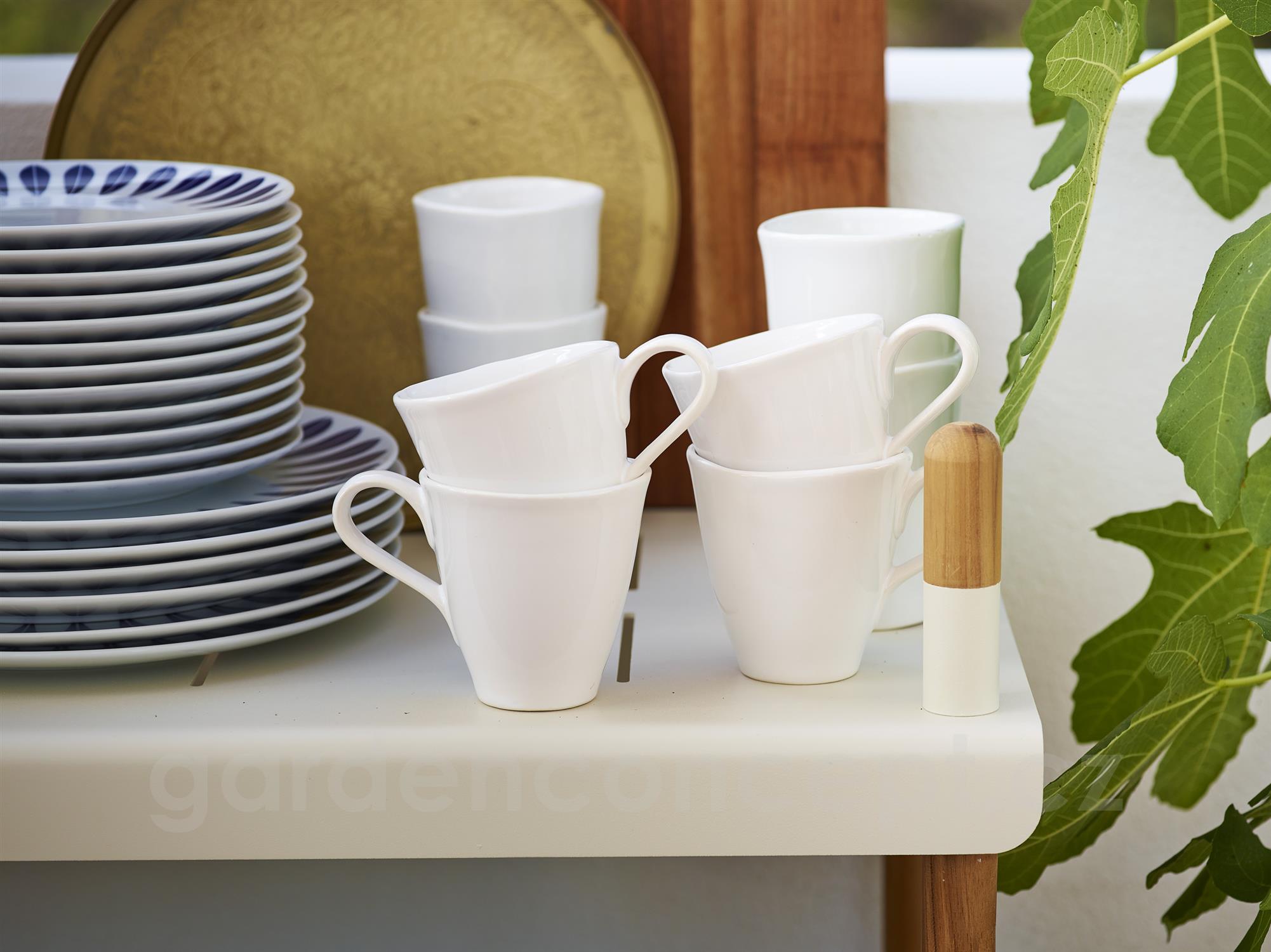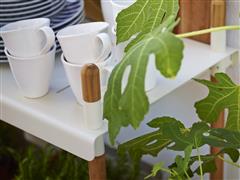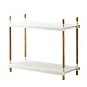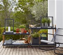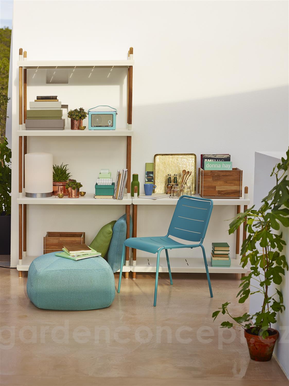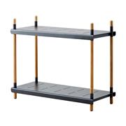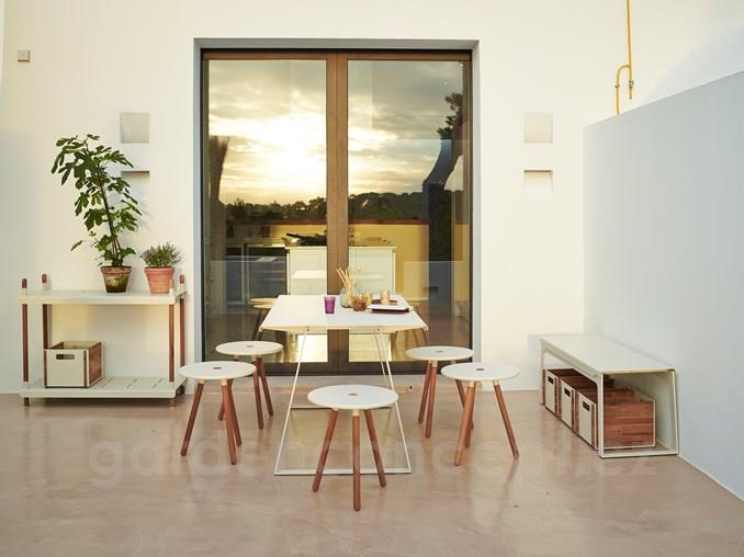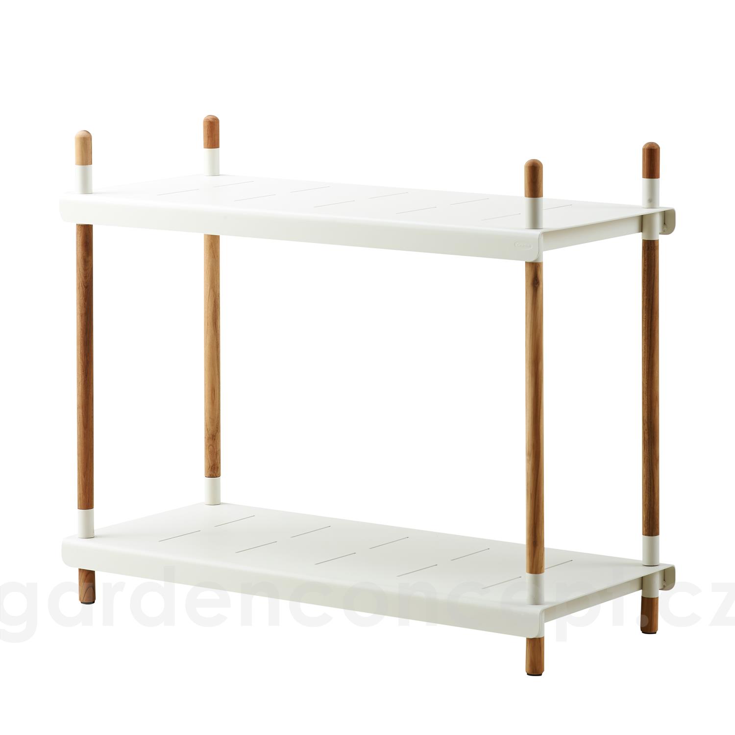 Policový modulární systém vyšší kolekce Frame značky Cane-line. Rám zahradního policového systému je z teakového dřeva. Police jsou z lakovaného hliníku.