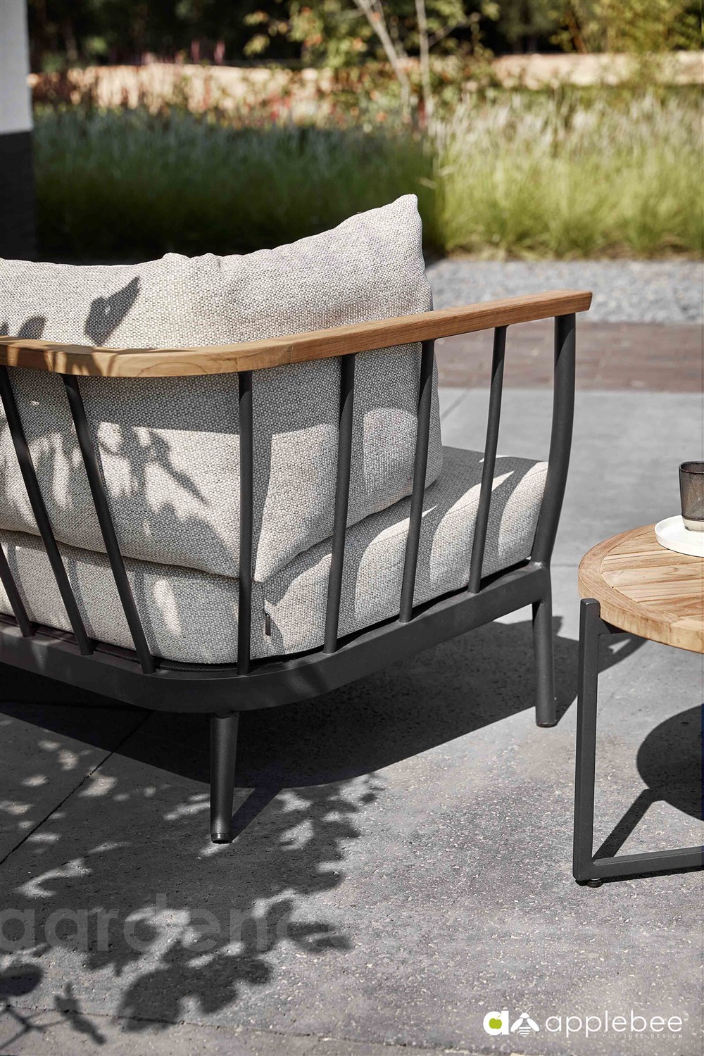 2-místná pohovka Condor, Apple Bee, 150x86x66 cm, rám hliník Black, područky teak, sedáky venkovní látka Natural Oak
