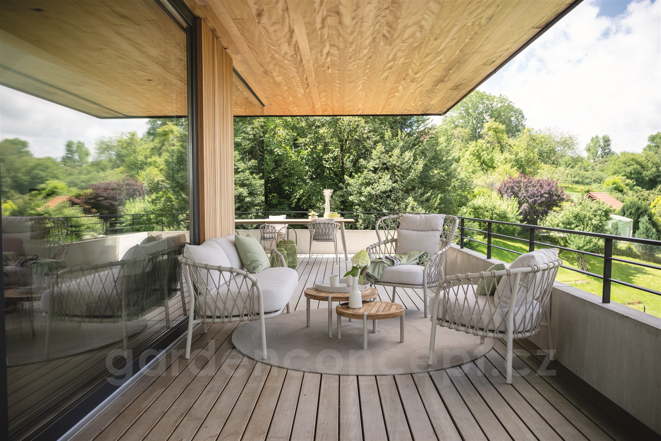 Sedák a polštáře jsou z venkovní látky. Výplň sedáků je z běžné pěny a proto je potřeba je chránit před velkým deštěm.