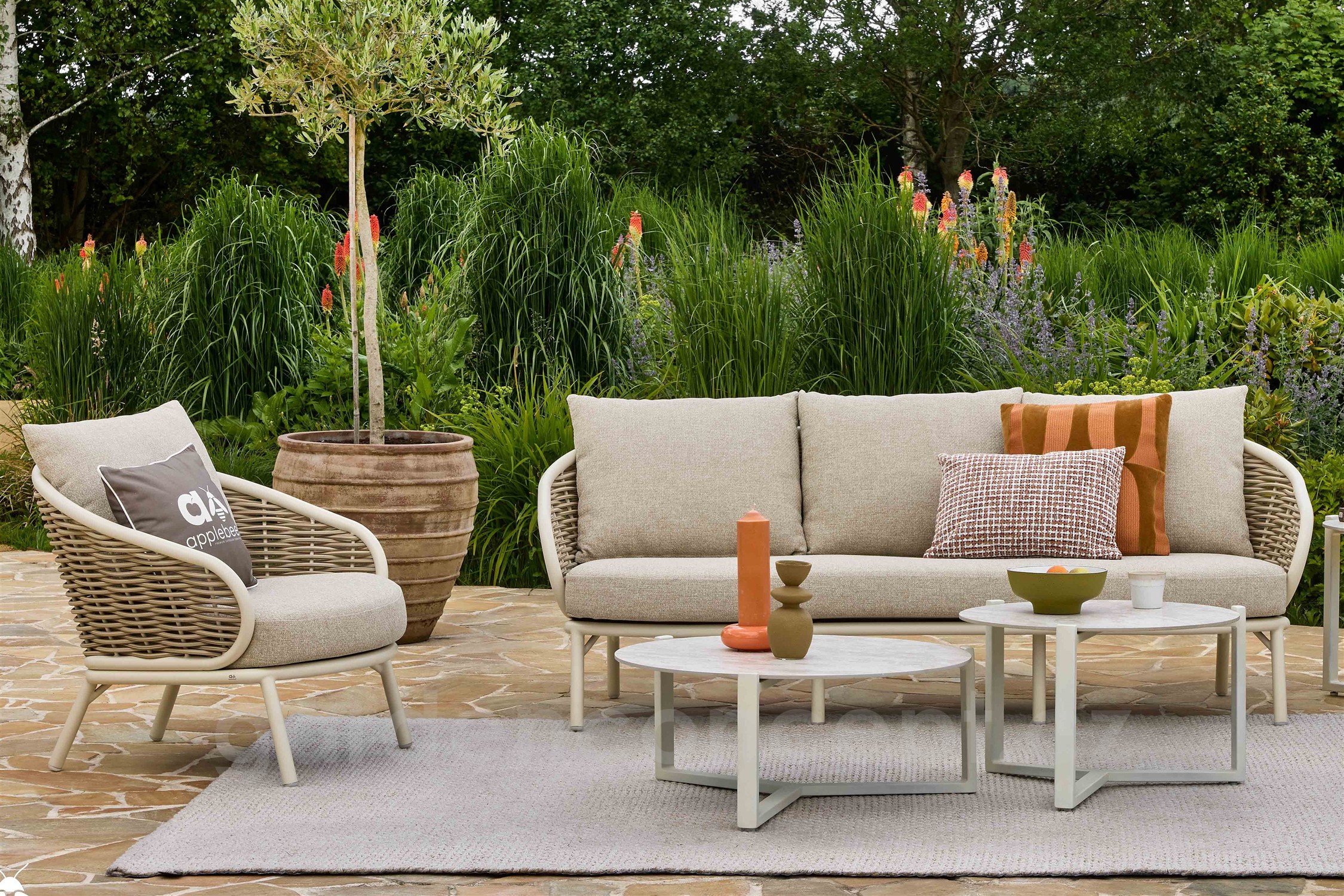 Elegantní 3- místná pohovka Pine Key od Apple Bee s rámem z lakovaného hliníku (barva dle vzorníku) a umělého ratanu, sedáky jsou z venkovní látky (barva dle vzorníku), mají rychleschnoucí výplně a mohou zůstat na dešťi.