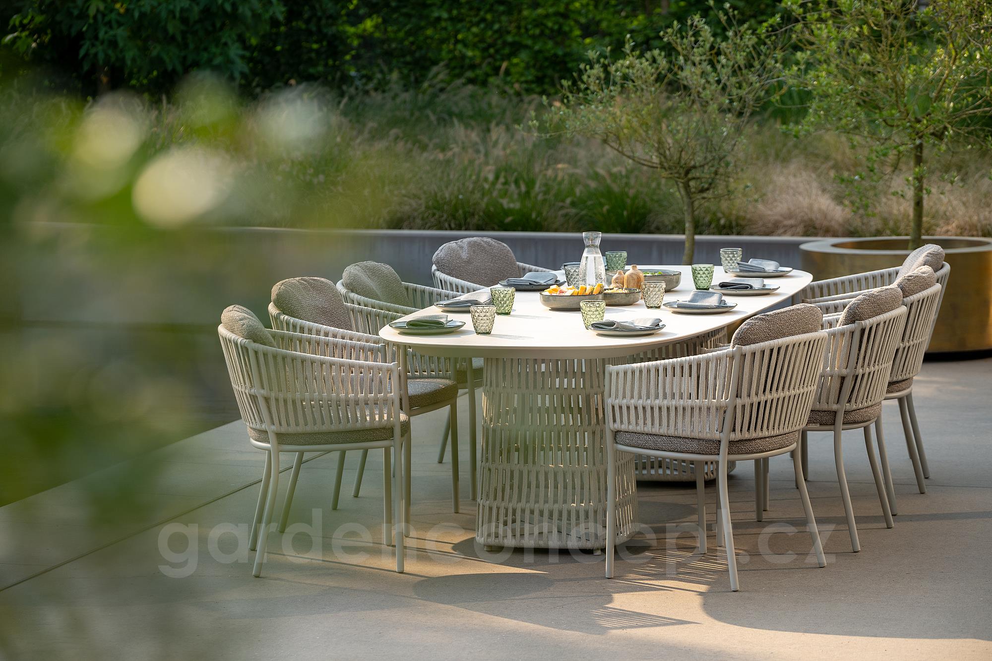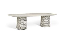 Jídelní stůl Cala, Jati Kebon, oválný 300x120x76 cm, hliník barva dune mat, výplet lanko barva linnen, deska keramika Chianca