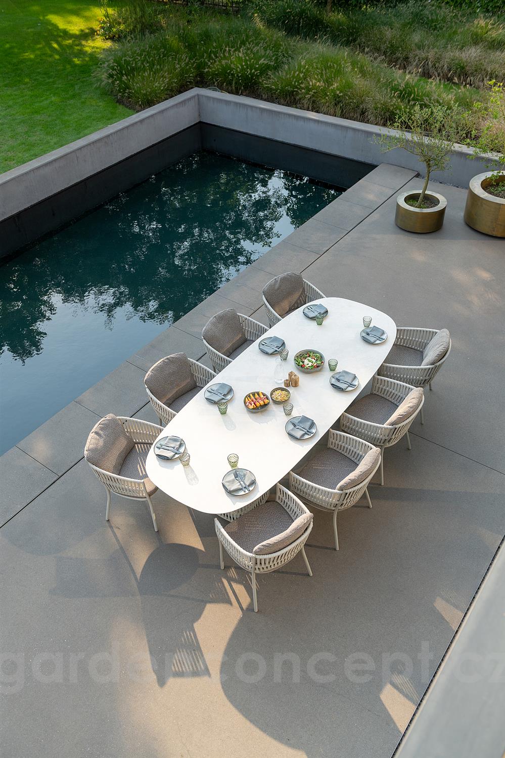 Jídelní stůl Cala, Jati Kebon, 300x120x76 cm, hliník, lanko, keramika