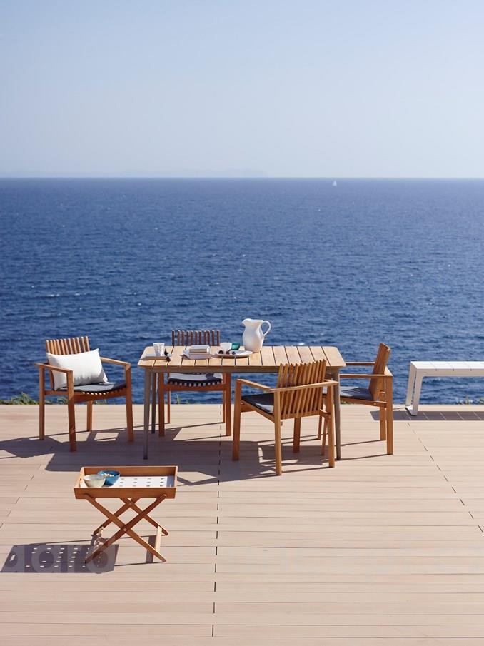 Hliníkový zahradní jídelní stůl kolekce Core značky Cane-line. Rám je z hliníku. Deska stolu je z teakového dřeva.