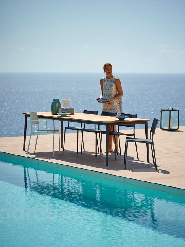 Hliníkový zahradní jídelní stůl kolekce Core značky Cane-line.Rám je z hliníku. Deska stolu je z teakového dřeva.
