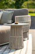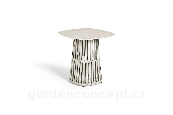 Odkládací stolek Cala, Jati Kebon, 50x50x32 cm, hliník barva dune mat, výplet lanko barva linnen, deska keramika Chianca