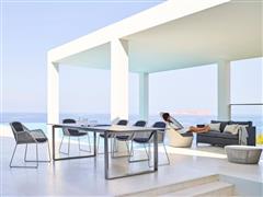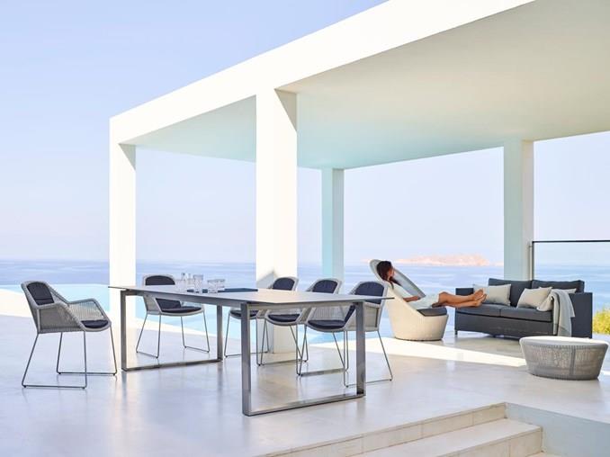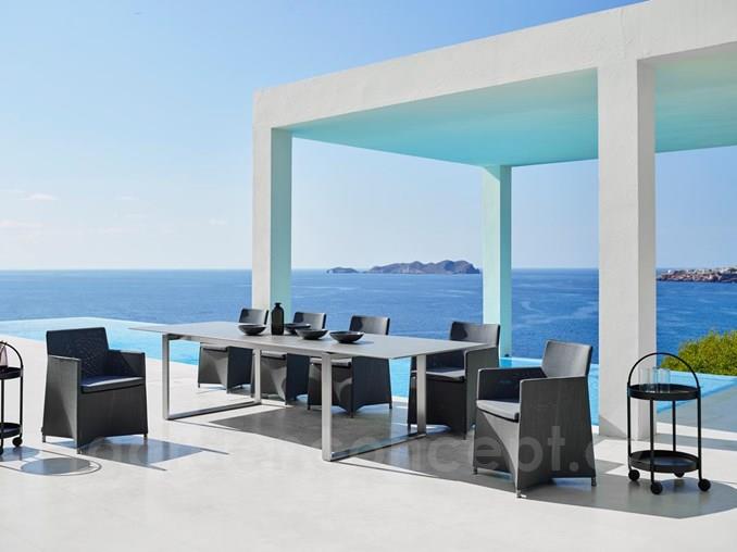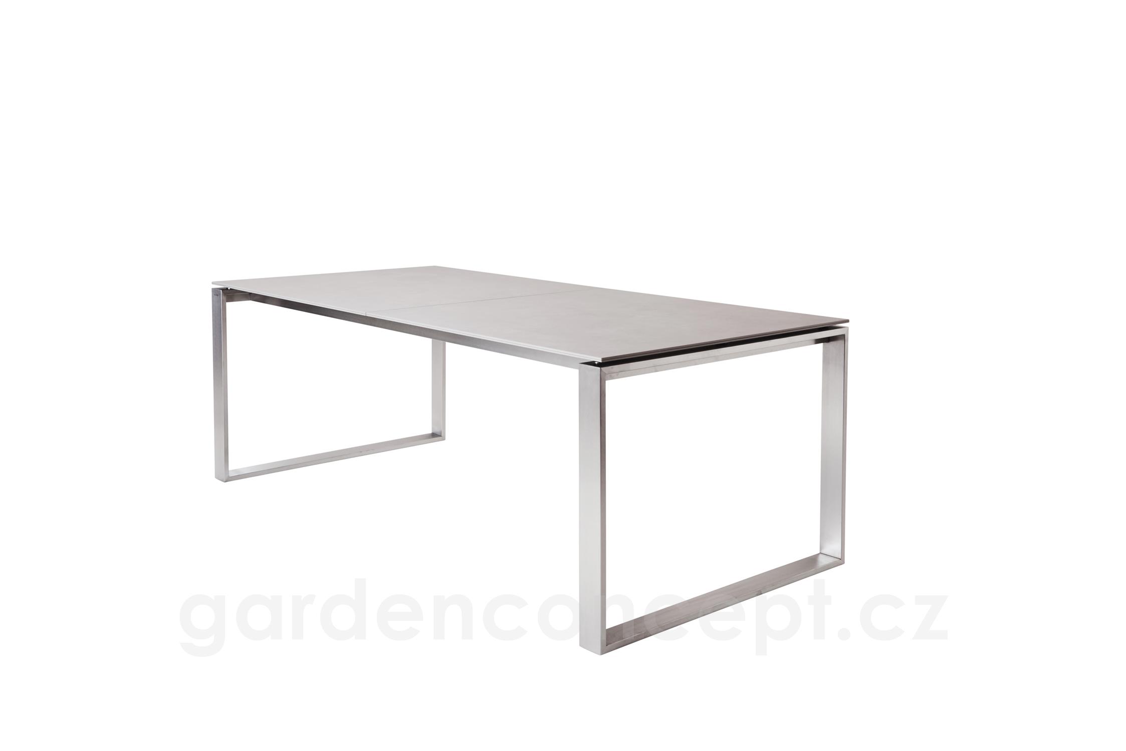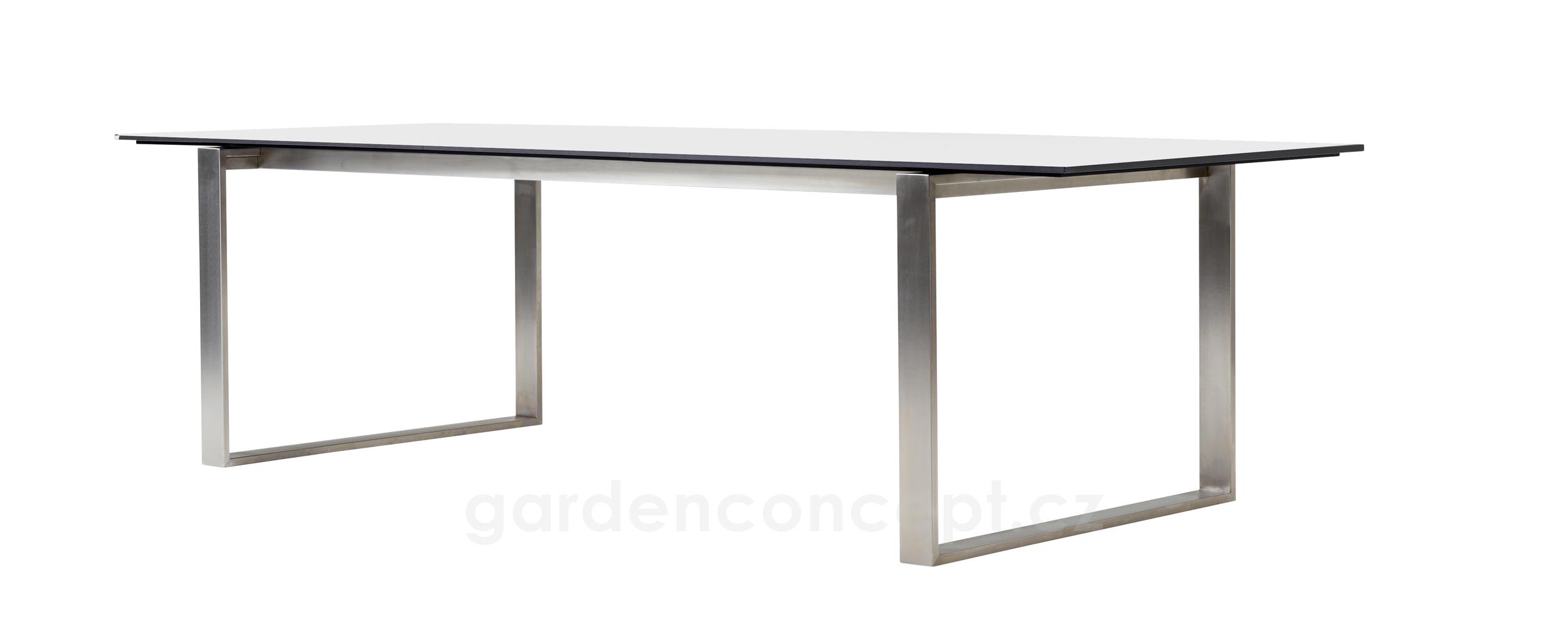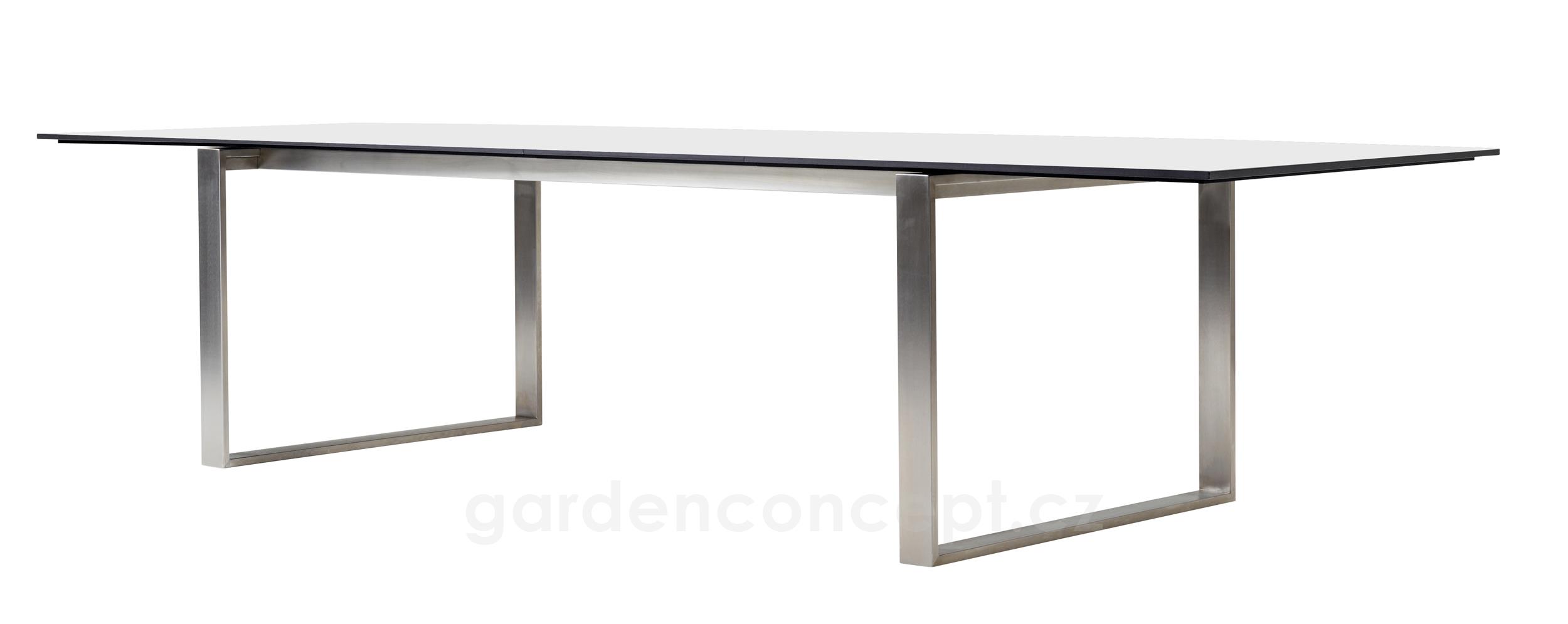 Rozkládací jídelní stůl kolekce Edge značky Cane-line s nerezovým rámem. Rám i desky se kupují zvlášť.