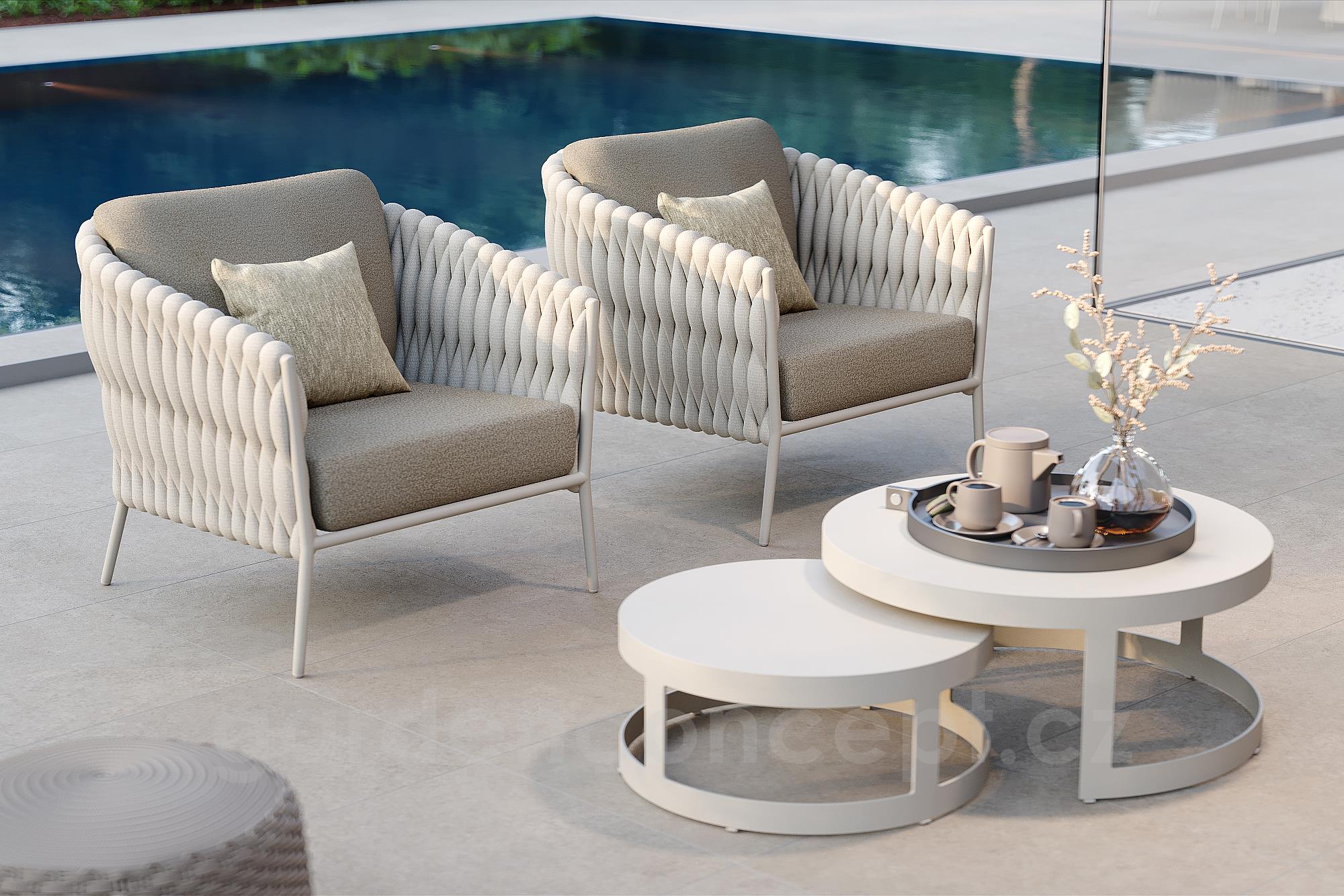 Nízké křeslo Fortuna Socks, Jati Kebon, 77x89x83 cm, rám hliník barva dune mat, výplet barva linen 14 mm, sedáky venkovní látka Sunproof Jalousie Beige
