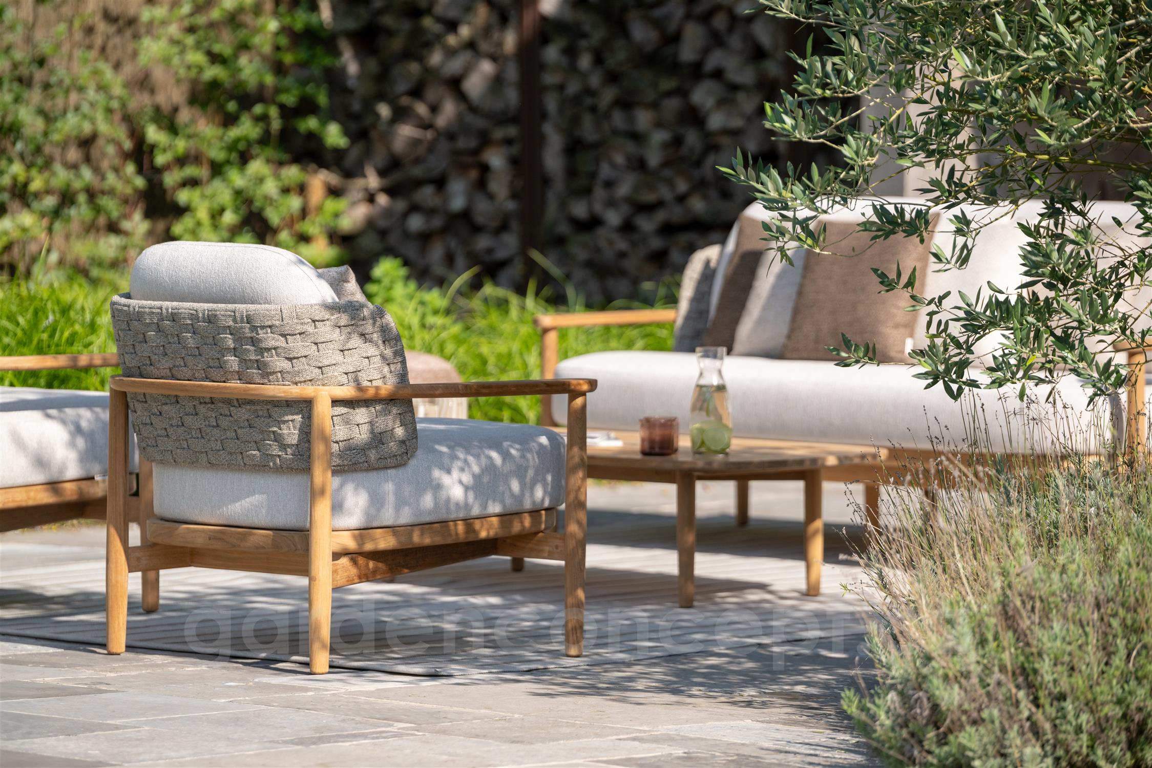 Teakové nízké křeslo Boho, Jati Kebon, teak, lanko, venkovní látka