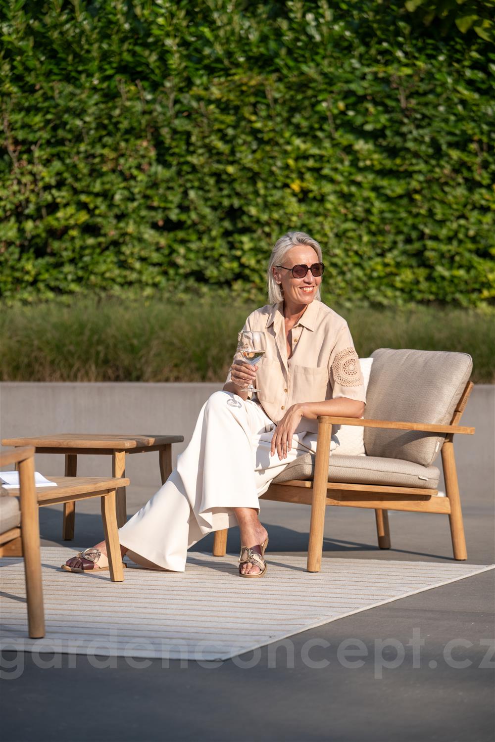 Sedák pro nízké křeslo Lynn Teak, Jati Kebon, venkovní látka Sunbrella Savane Coconut